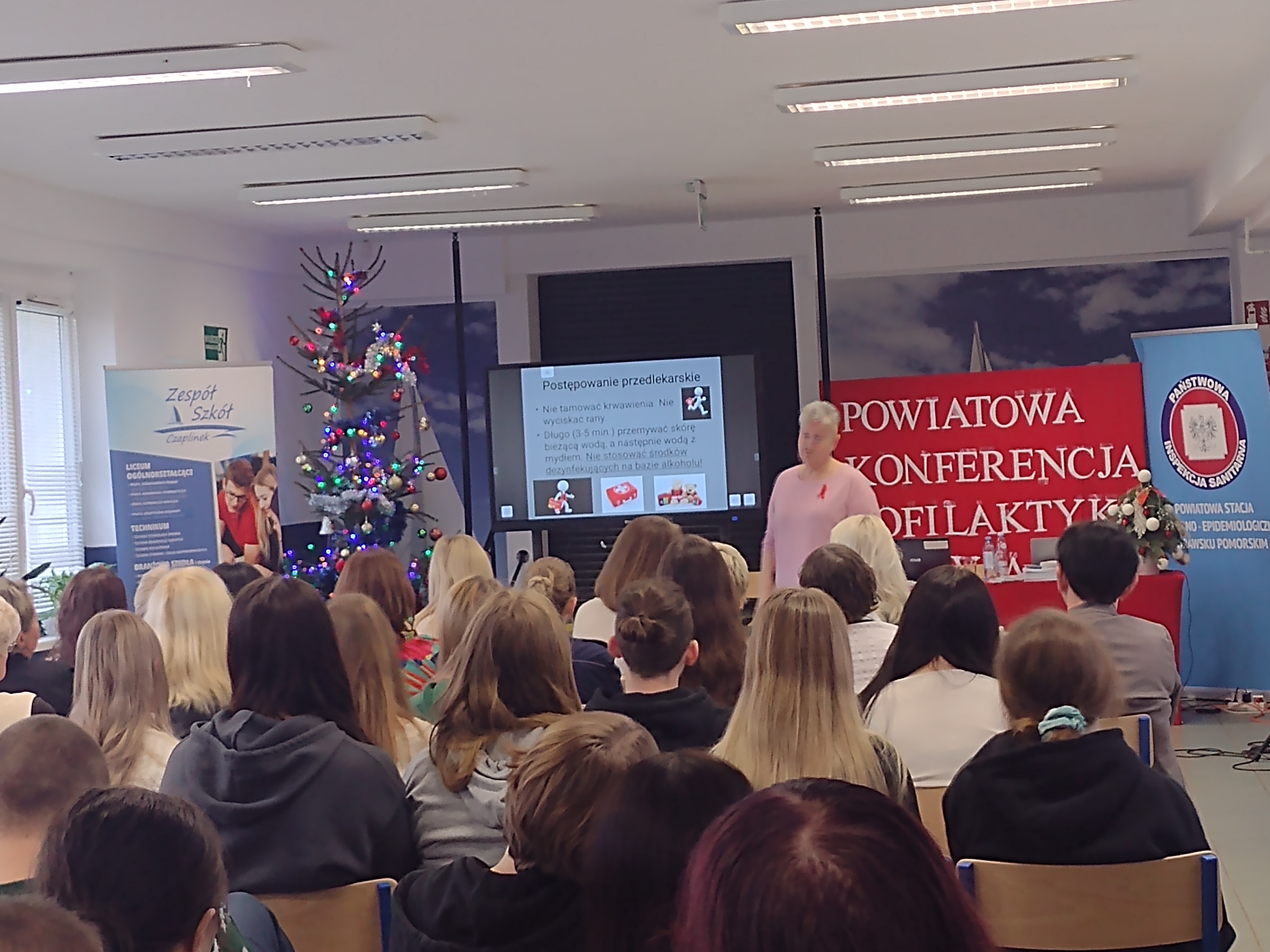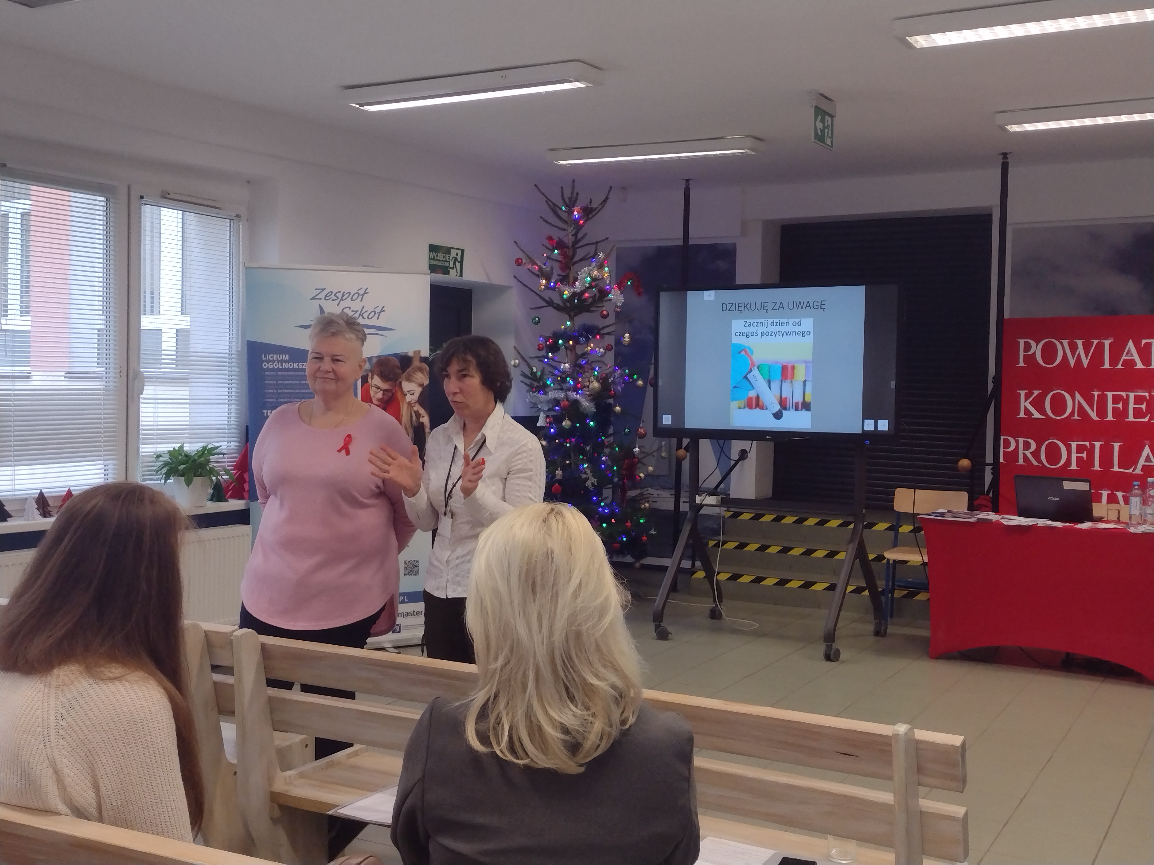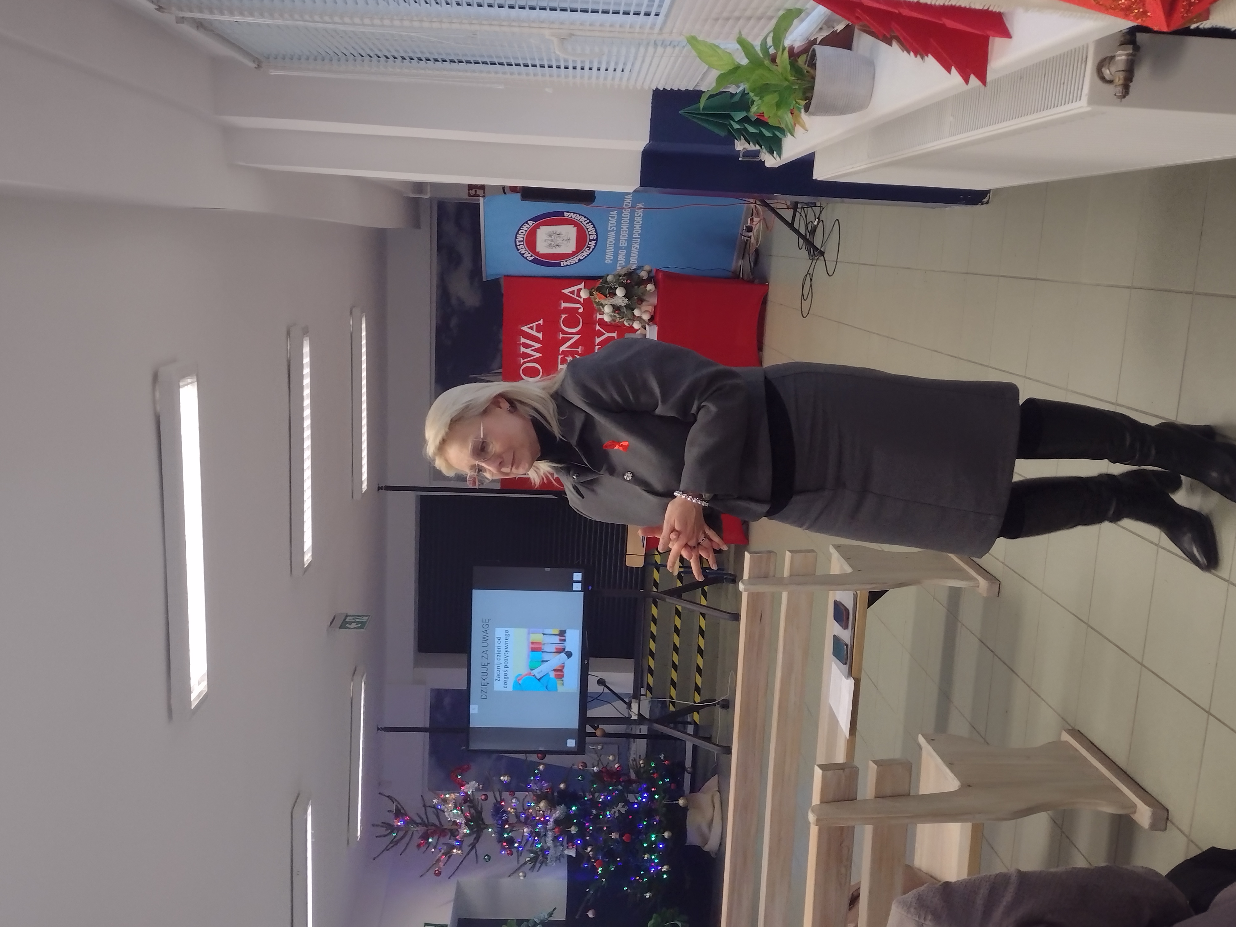 W dniu 12 grudnia 2024 roku w siedzibie LO w Czaplinku zebrali się zaproszeni goście – osoby zainteresowane tematyką HIV-AIDS (dyrektorzy placówek edukacyjnych, pedagodzy, promotorzy zdrowia, pracownicy podmiotów działalności leczniczej, funkcjonariusze służb mundurowych, pracownicy służb socjalnych oraz młodzież starszych klas szkół ponadpodstawowych. W roli Gościa – Prelegenta wystąpiła Pani Izabela Jadwiżyc, promotor zdrowia z Oświaty Zdrowotnej i Promocji Zdrowia PSSE w Szczecinku, która jako Konsultant KC ds. AIDS posiada wieloletnią praktykę w pracy z osobami podejmującymi ryzykowne zachowania i w przystępny sposób, zwłaszcza dla młodzieży szkolnej, przekazuje wiedzę o zakażeniach HIV i zwalczaniu AIDS.