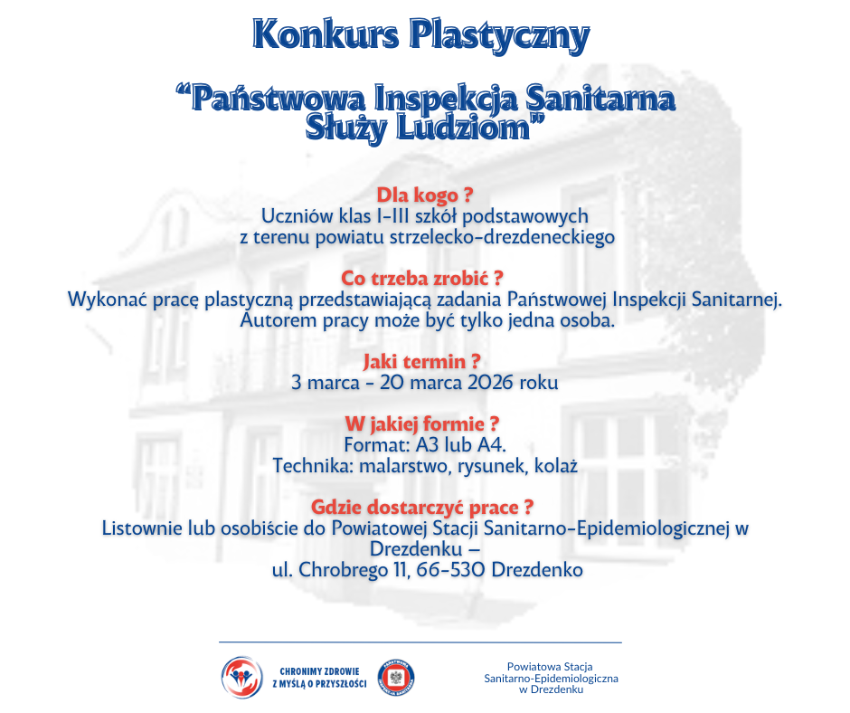 Wzorem ubiegłego roku Państwowy Powiatowy Inspektor Sanitarny w Drezdenku ponownie organizuje Powiatowy Konkurs Plastyczny pn. „Państwowa Inspekcja Sanitarna Służy Ludziom”.
