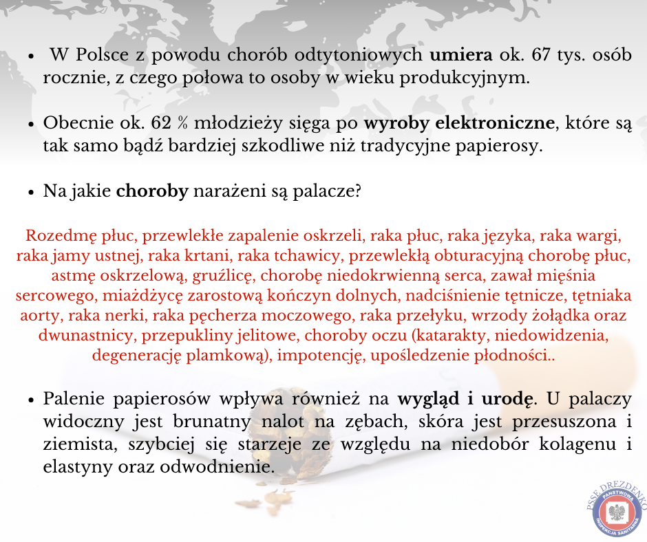 Nie od dziś wiadomo, że palenie papierosów niesie za sobą niebezpieczne dla zdrowia skutki. Dym tytoniowy zawiera ponad 4 000 związków chemicznych, w tym ponad 40 znanych czynników rakotwórczych oraz szereg środków toksycznych. Według badań przeprowadzonych przez Uniwersytet w Bristolu przeciętny palacz żyje 10 lat krócej niż osoba niepaląca. Każdy papieros kosztuje 11 minut życia!