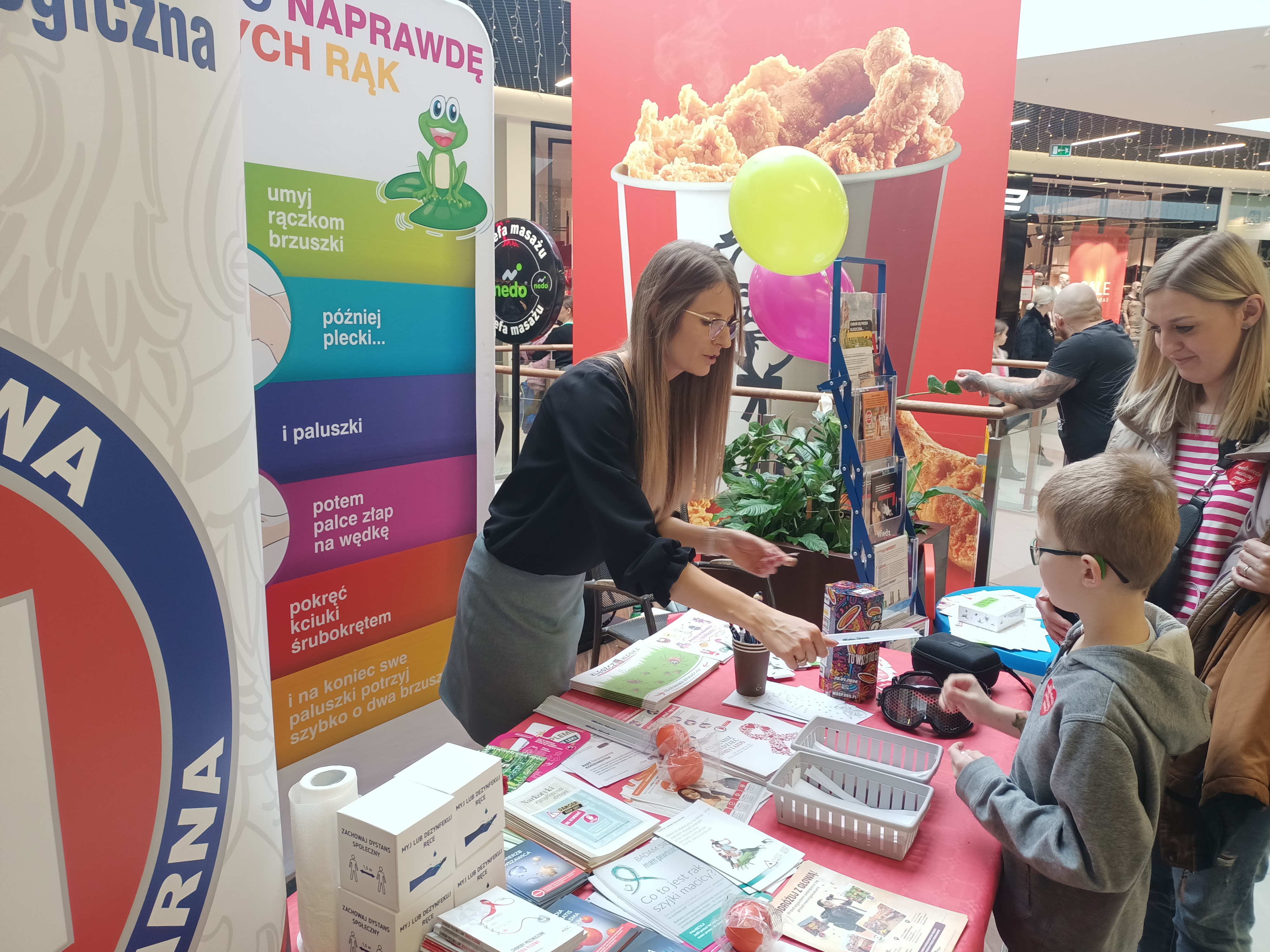 Przy naszym stoisku można było uzyskać porady z zakresu prawidłowego żywienia, profilaktyki tytoniowej i badań przesiewowych, jak również wykonać pomiar zawartości tlenku węgla w wydychanym powietrzu, czy sprawdzić jak pomocą narkogogli i alkogogli jak substancje psychoaktywne działają na organizm.