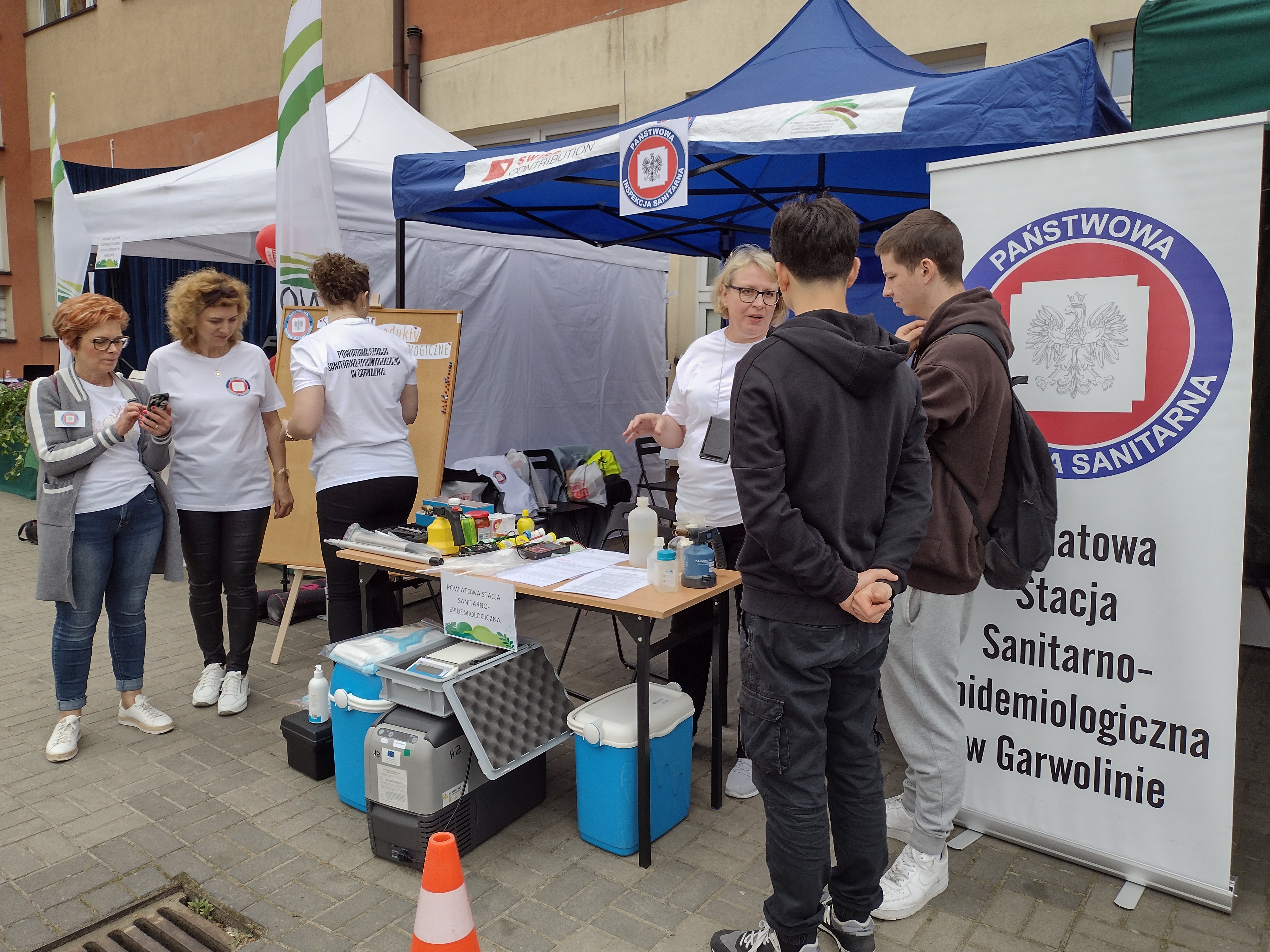 Przedstawiciele Powiatowej Stacji Sanitarno-Epidemiologicznej w Garwolinie na zorganizowanym stoisku informacyjnym przekazywali wiedzę o zadaniach Państwowej Inspekcji Sanitarnej i pokazywali zainteresowanej młodzieży w jaki sposób troszczyć się o zdrowie.