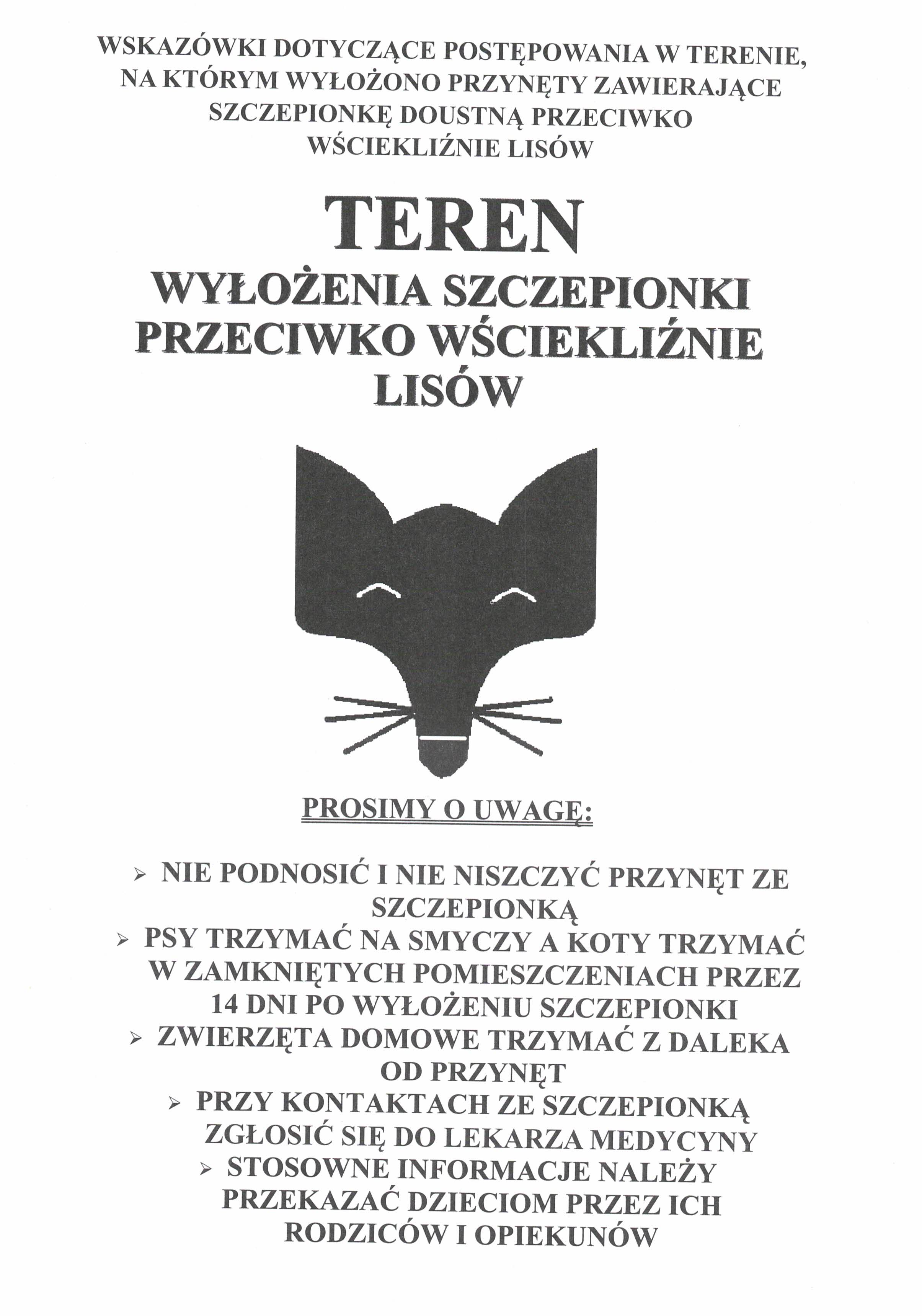 Komunikat - szczepienie lisów 15-30 listopada 2021 r. - plakatKomunikat_szczepienie_lisów_15-30_listopada_2021.pdf 0.79MB Wskazówki dla mieszkańców terenów, na których zostaną wyłożone przynęty ze szczepionką przeciwko wściekliźnie lisów