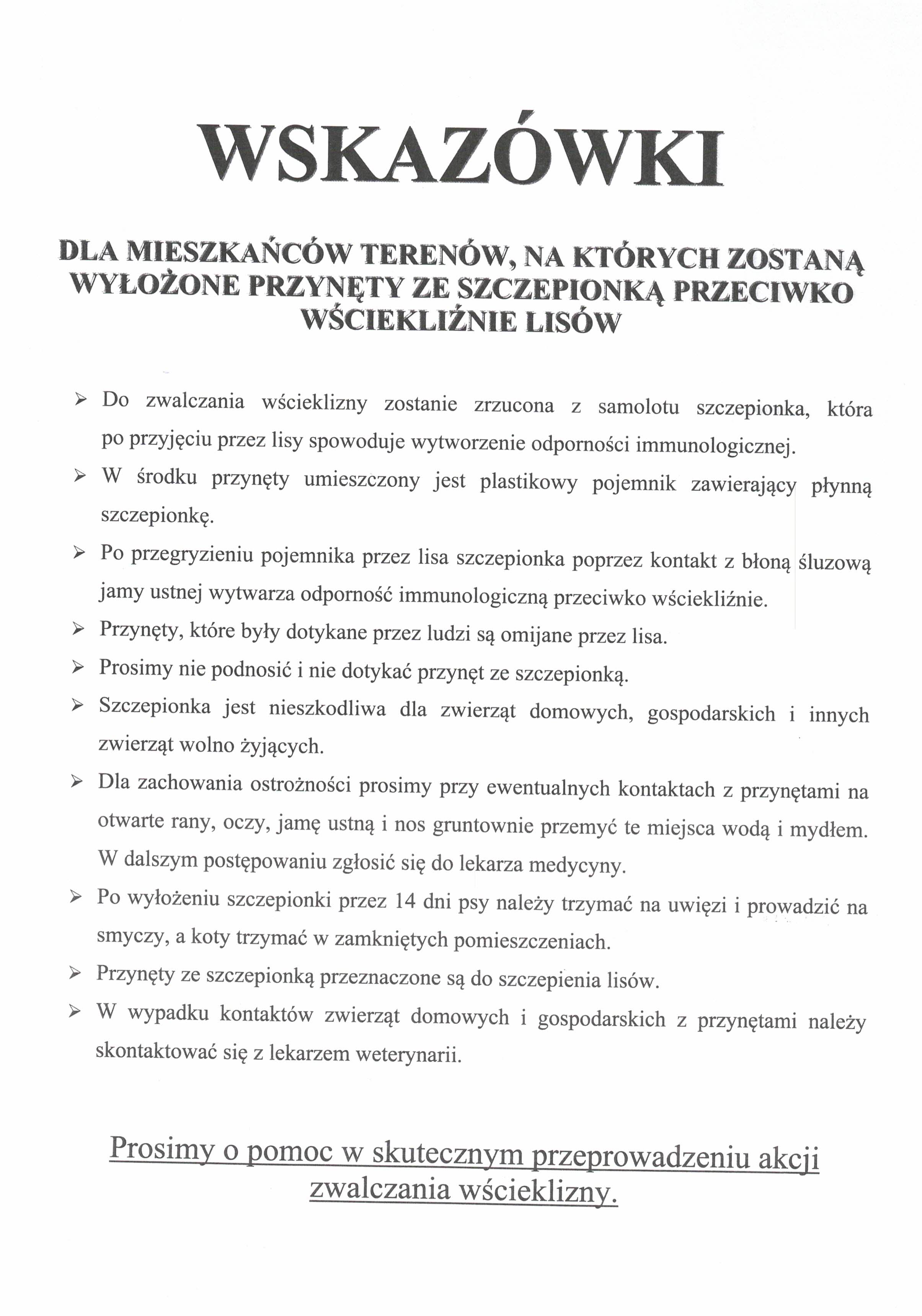 Wskazówki.pdf 0.53MB Wskazówki dotyczące postępowania w terenie, na którym wyłożono przynęty zawierające szczepionkę doustną przeciwko wściekliźnie lisów