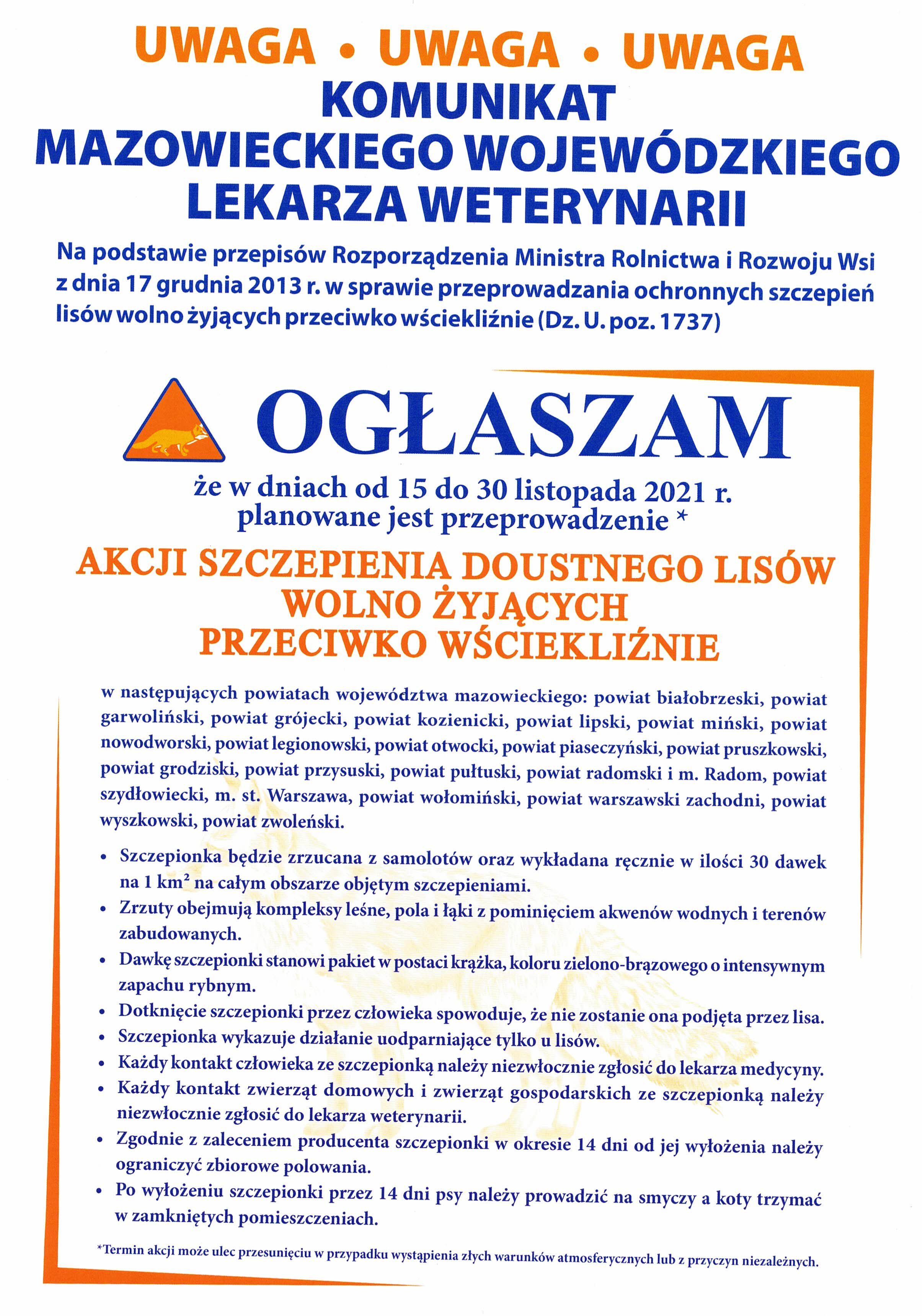 Państwowy Powiatowy Inspektor Sanitarny w Garwolinie , zgodnie z Komunikatem Mazowieckiego Wojewódzkiego Lekarza Weterynarii informuje, że w dniach od 15 do 30 listopada 2021 r. na terenie województwa mazowieckiego, w następujących powiatach tj.: białobrzeskim, garwolińskim, grójeckim, kozienickim, lipskim, łosickim, mińskim, nowodworskim, legionowskim, otwockim, piaseczyńskim, pruszkowskim, grodziskim, przysuskim, pułtuskim, radomskim i m. Radom, szydłowieckim, wołomińskim, warszawskim zachodnim, wyszkowskim, zwoleńskim, m. st. Warszawa zostanie przeprowadzona akcja szczepienia doustnego lisów wolno żyjących przeciwko wściekliźnie.