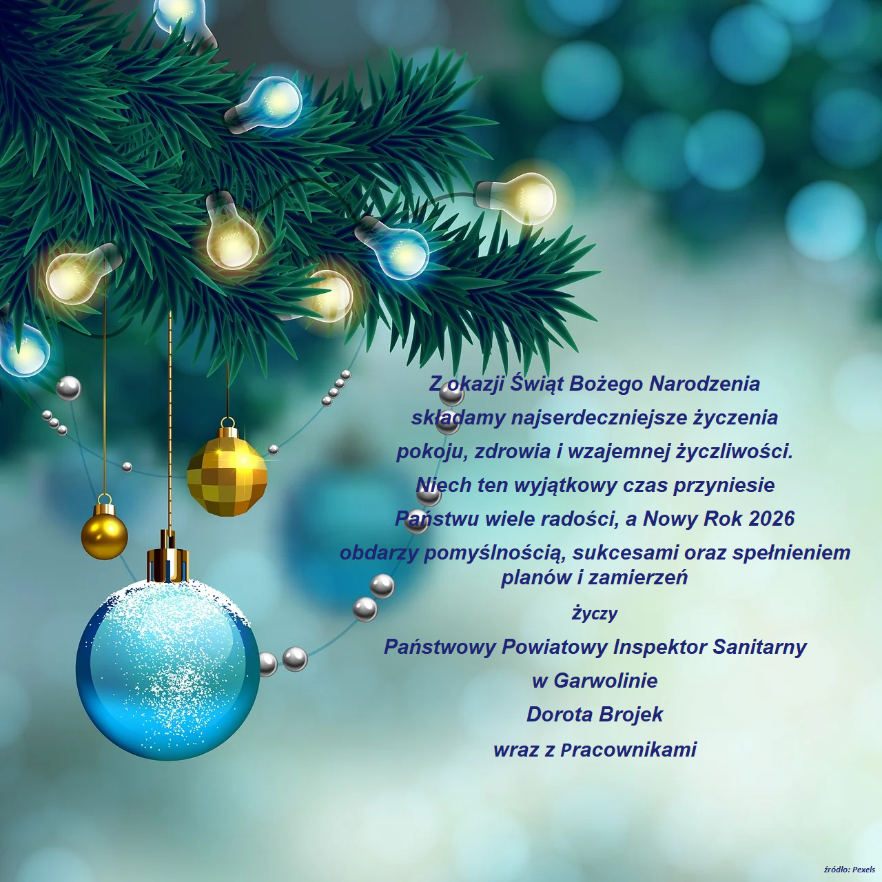 Z okazji Świąt Bożego Narodzenia składamy najserdeczniejsze życzenia pokoju, zdrowia i wzajemnej życzliwości. Niech ten wyjątkowy czas przyniesie Państwu wiele radości, a Nowy Rok 2026 obdarzy pomyślnością, sukcesami oraz spełnieniem planów i zamierzeń, życzy Państwowy Powiatowy Inspektor Sanitarny w Garwolinie Dorota Brojek wraz z Pracownikami.