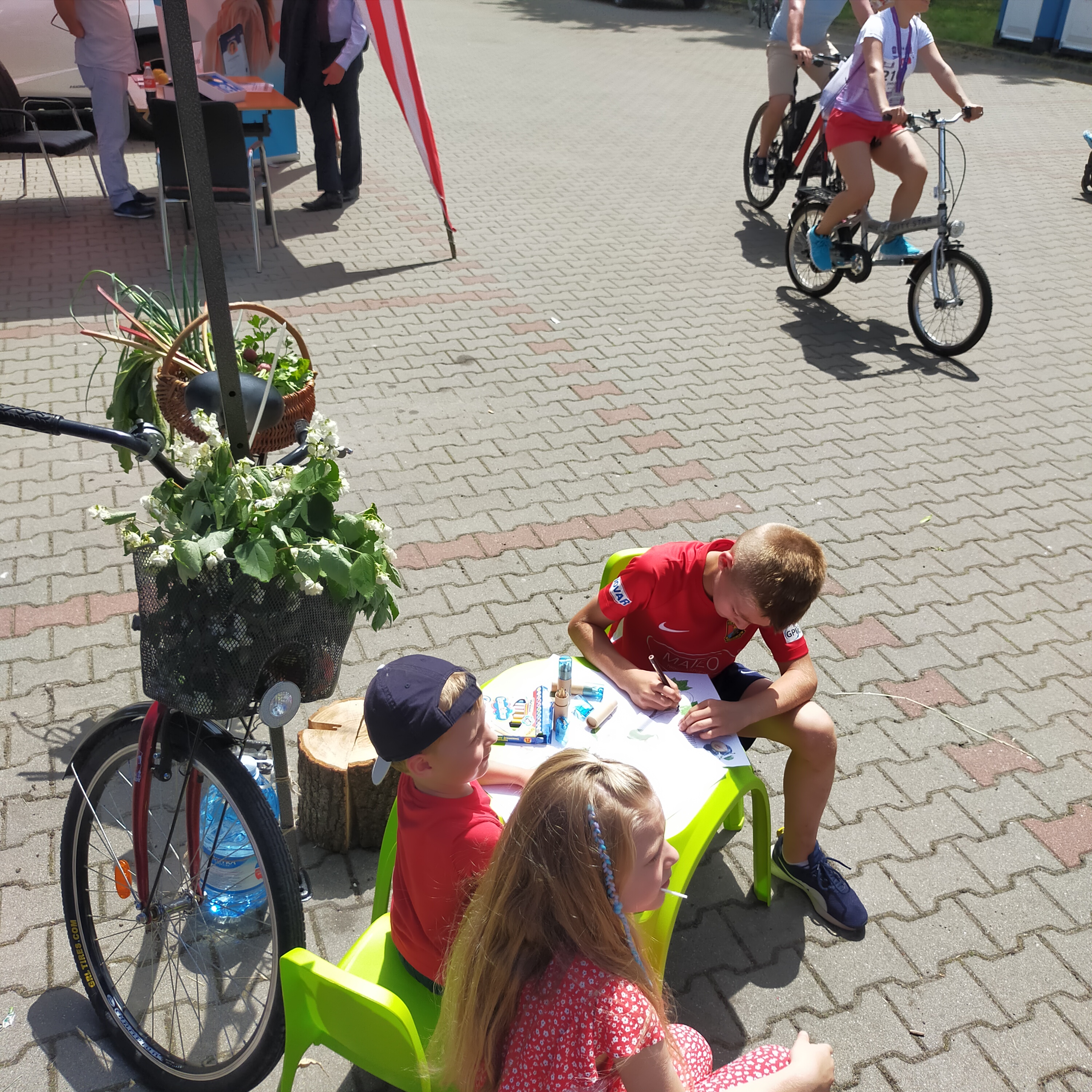3. Ekspozycję warzyw, ziół i kwiatów ułożonych w koszach na rowerze oraz ułożone jabłka w skrzynce na stoliku, którymi częstowały się osoby odwiedzające stoisko.