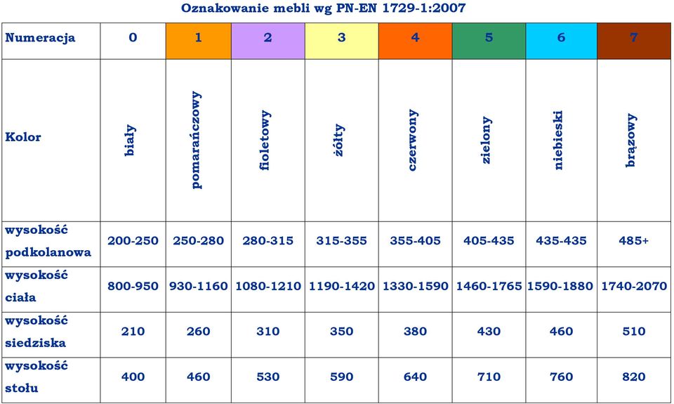 oraz prawidłowo zestawione, tzn. numer stołu musi odpowiadać numerowi krzesła. Numer mebla może być zastąpiony kolorem określonym w PN (zgodnie z załączoną tabelą); - każde uczeń/dziecko w szkole/przedszkolu powinien mieć dwa razy w roku zmierzoną wysokość ciała i wysokość podkolanową (odległość od podłogi do zgięcia podkolanowego wykonane w pozycji siedzącej) i na tej podstawie dostosowany właściwy rozmiar mebli zgodnie z zasadami zawartymi w PN, wg załączonej tabeli;