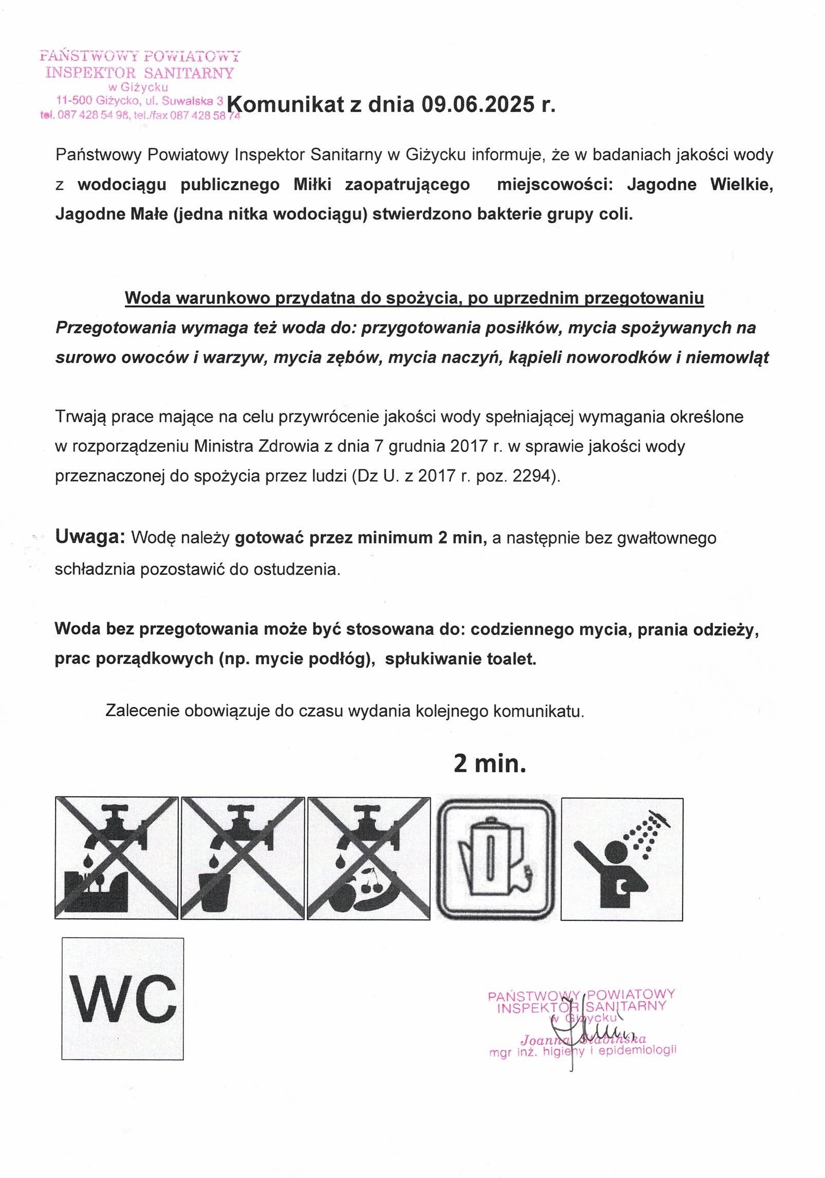 Komunikat z dnia 09.06.2025 r. (dot. wodociągu publicznego Miłki)