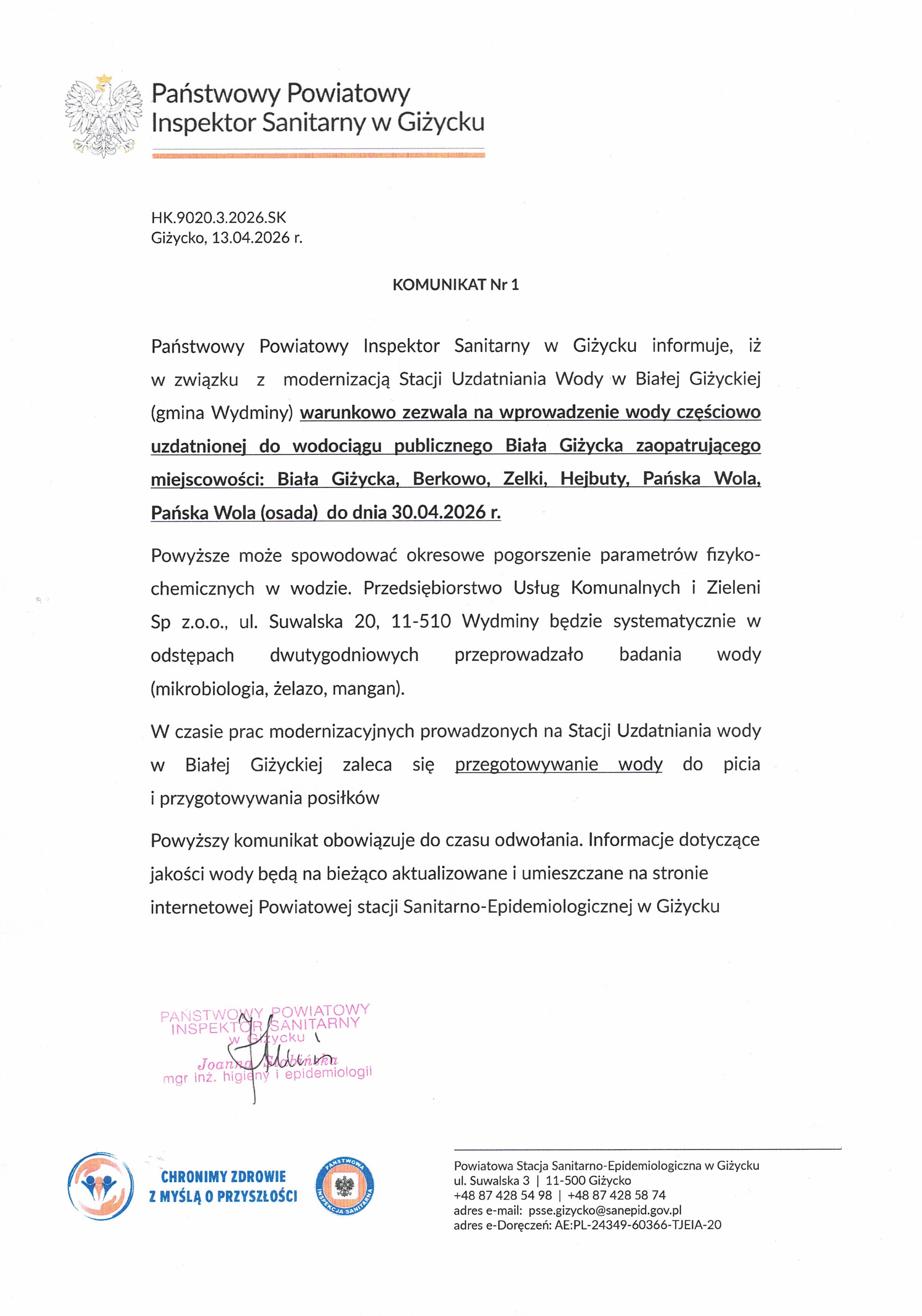 Komunikat z dnia 13.04.2026 r. (dot. wodociągu publicznego Biała Giżycka)