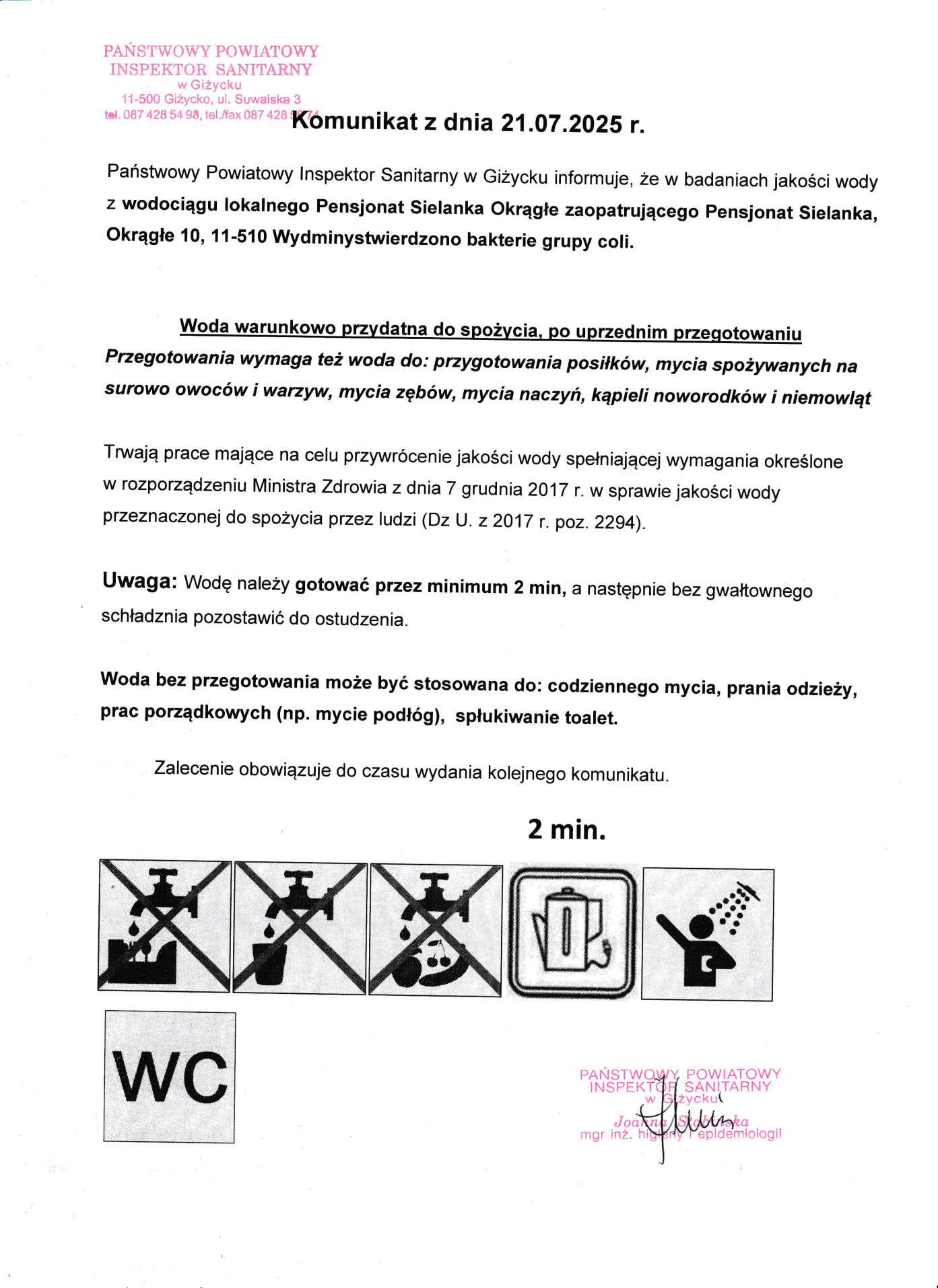 Komunikat z dnia 21.07.2025 r. (dot. wodociągu lokalnego Pensjonat Sielanka Okrągłe)