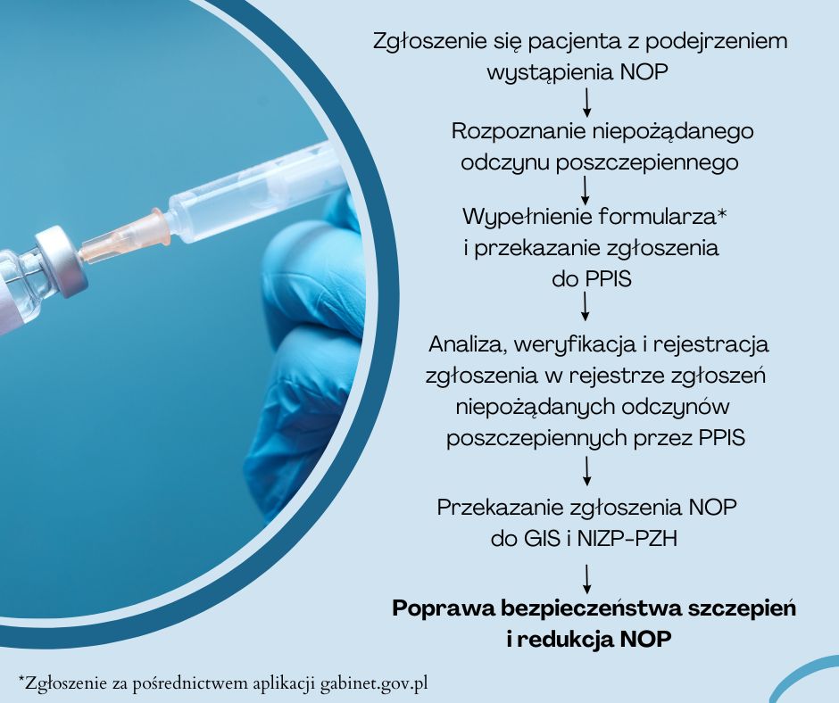 Lekarz lub felczer który podejrzewa lub rozpoznaje wystąpienie niepożądanego odczynu poszczepiennego, ma obowiązek, w ciągu 24 godzin od powzięcia podejrzenia jego wystąpienia zgłosić NOP do Państwowego Powiatowego Inspektora Sanitarnego właściwego dla miejsca powzięcia podejrzenia jego wystąpienia:
