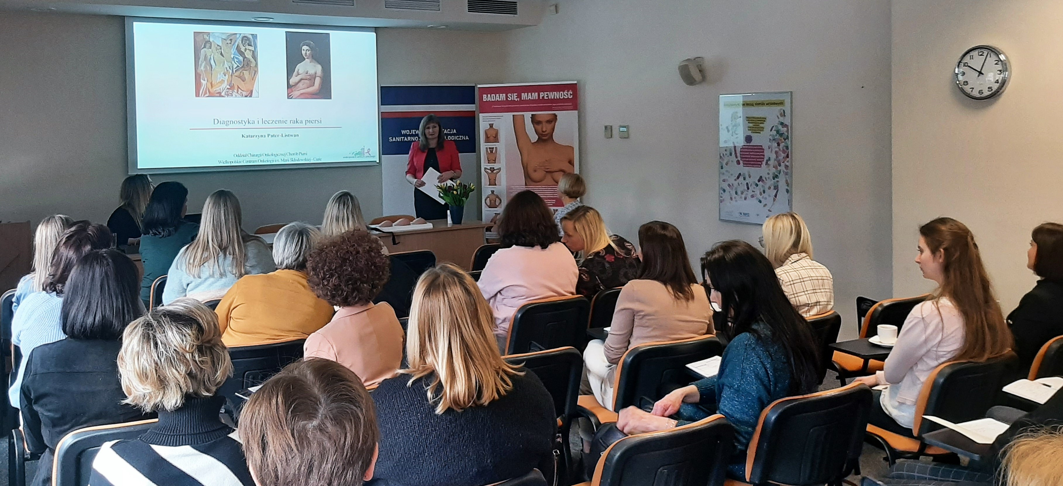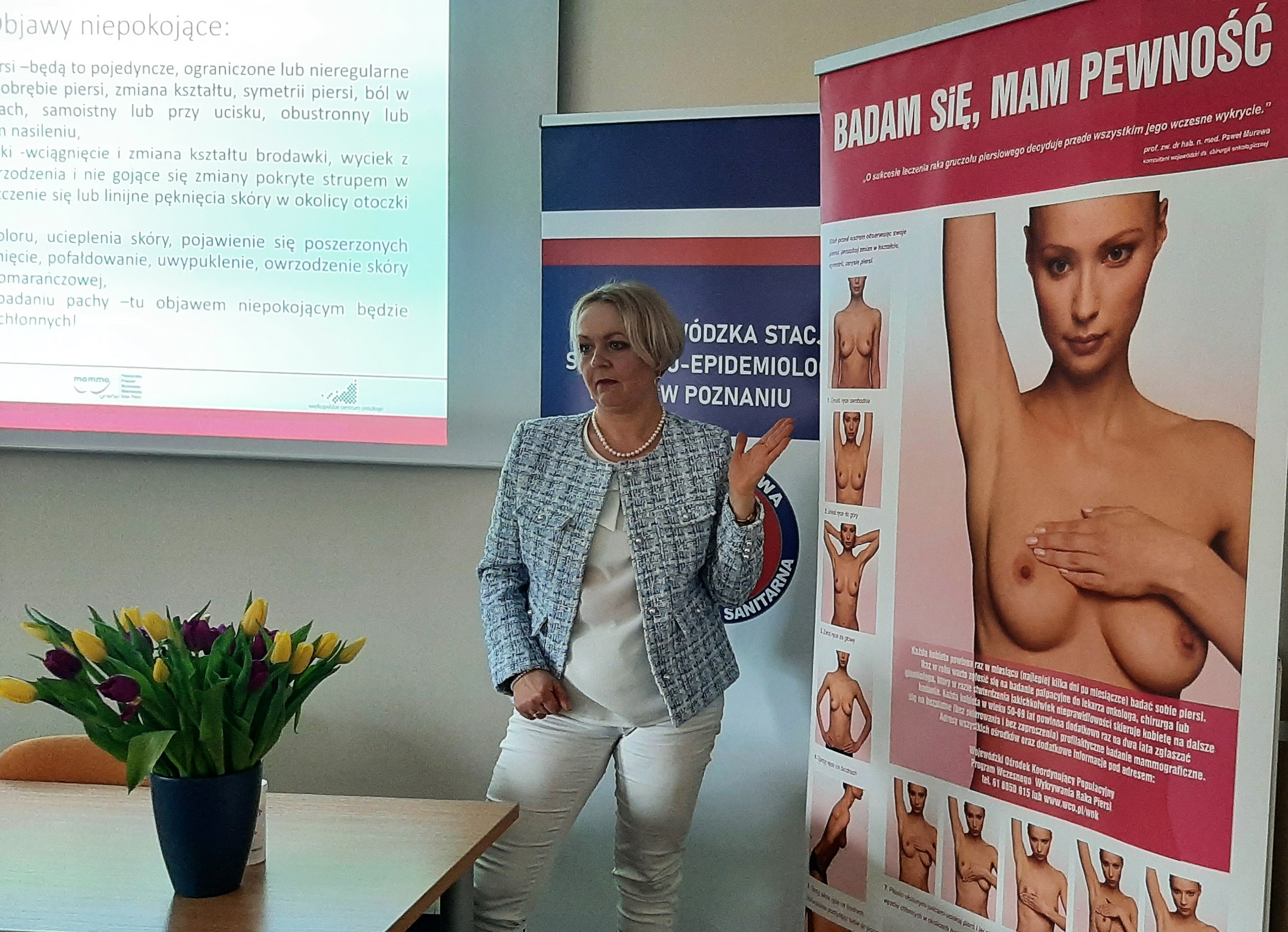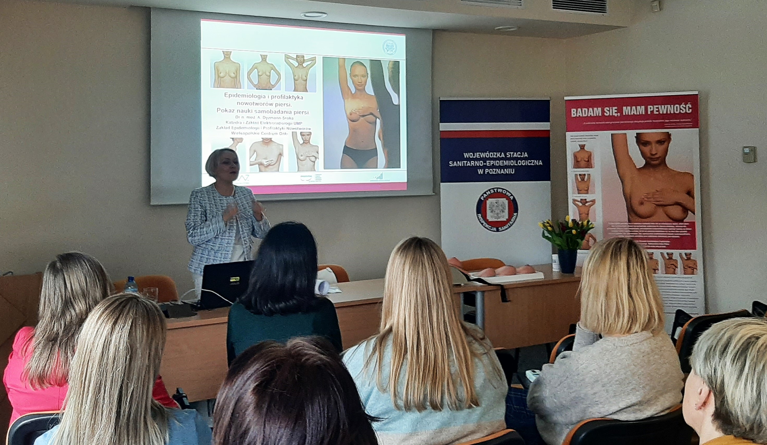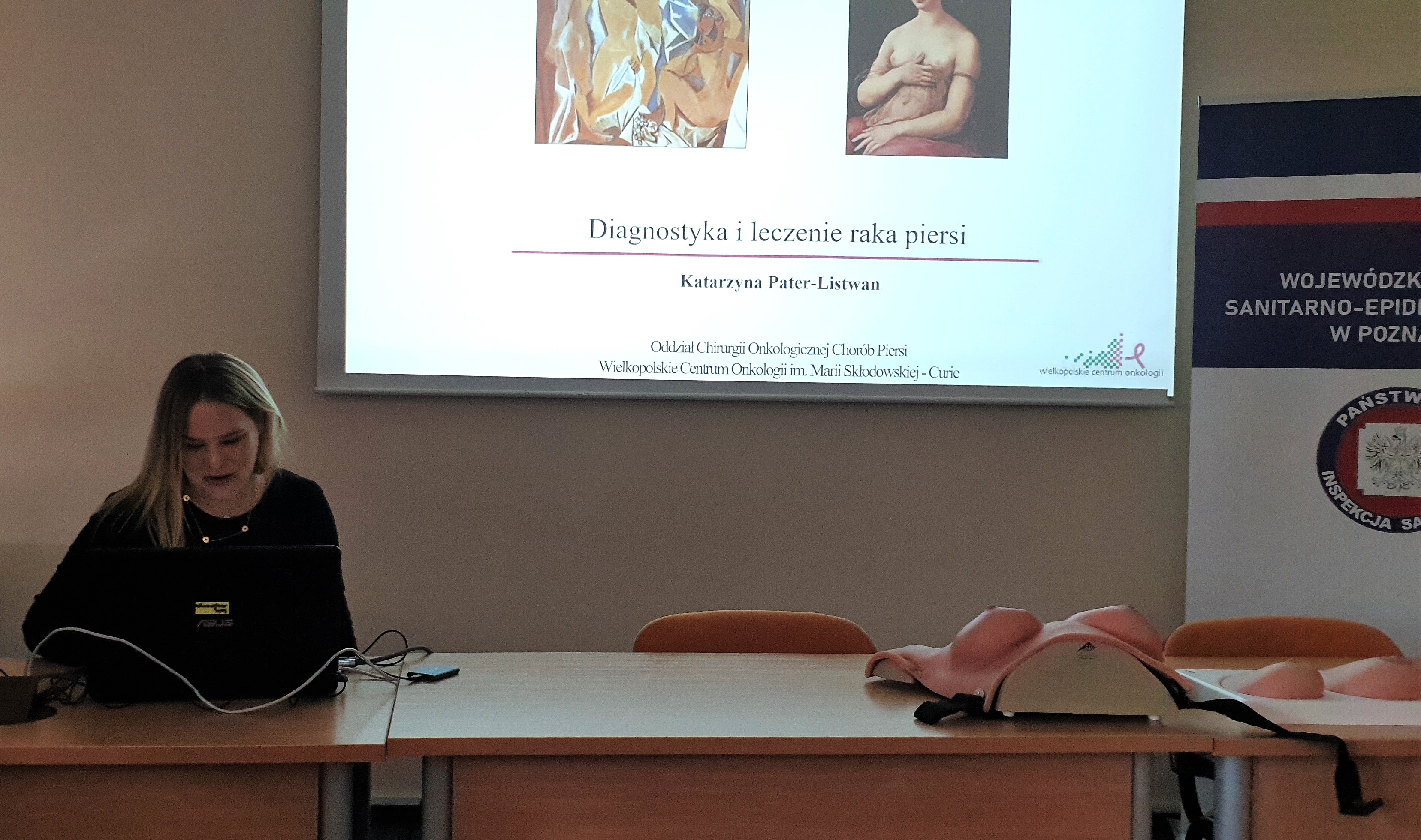 Szkolenie otworzyła Pani Hanna Kurek – Zastępca Wielkopolskiego Państwowego Wojewódzkiego Inspektora Sanitarnego, następnie uczestnicy wysłuchali wykładów „Diagnostyka i leczenie chorób piersi” Lek. Katarzyny Pater – Listwan, Starszego Asystenta Oddziału Chirurgii Onkologicznej Chorób Piersi Wielkopolskiego Centrum Onkologii oraz „Epidemiologia i profilaktyka nowotworów piersi” Pani dr n. med. Agnieszki Dyzmann – Sroki - Kierownika Zakładu Epidemiologii i Profilaktyki Nowotworów Wielkopolskiego Centrum Onkologii. Następnie zebrani wzięli udział w pokazie nauki samobadania piersi oraz poznali założenia projektu edukacyjnego pt.: „Co kryją Twoje piersi?”.