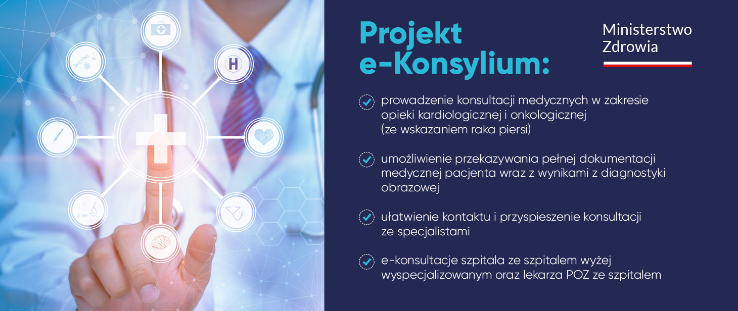 W rozpoczętym właśnie w Uniwersyteckim Szpitalu Klinicznym im. Jana Mikulicza-Radeckiego we Wrocławiu pilotażu będą możliwe konsultacje kardiologiczne oraz onkologiczne w zakresie nowotworu piersi. Łącznie działać będzie osiem sieci w ramach projektu e-konsylium: po cztery z dziedziny kardiologii i onkologii oraz czterdzieści szpitali partnerskich: po dwadzieścia z każdej specjalizacji. Do tego dochodzi osiemdziesiąt placówek POZ: po czterdzieści z każdej specjalizacji. Z e-konsultacji specjalistycznych skorzysta co najmniej 4 tys. pacjentów.