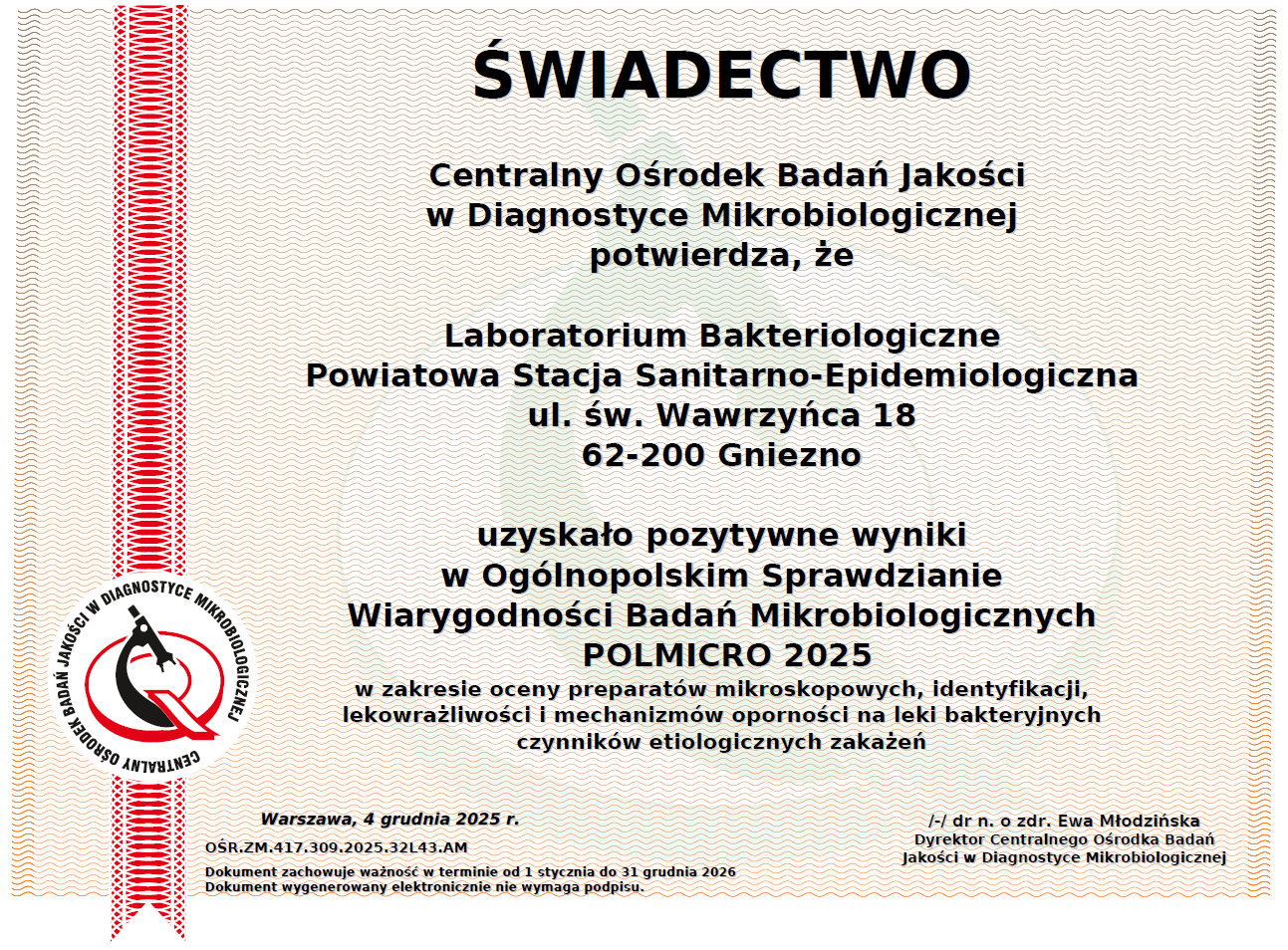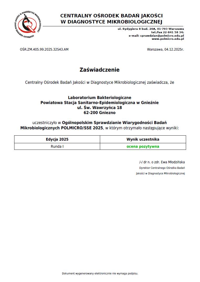 Szanowni Państwo, Z przyjemnością informujemy, że Laboratorium Powiatowej Stacji Sanitarno-Epidemiologicznej w Gnieźnie uzyskało certyfikaty POLMICRO oraz POLMICRO SSE, a także pozytywne wyniki uczestnictwa w III rundzie międzynarodowego sprawdzianu LabQuality, potwierdzające najwyższe standardy jakości, rzetelności oraz zgodności z aktualnymi rekomendacjami mikrobiologicznymi. Certyfikaty te stanowią dowód, że stosowane procedury badawcze, wyposażenie oraz kwalifikacje personelu spełniają restrykcyjne kryteria oceny, a wyniki analiz są wiarygodne i zgodne z międzynarodowymi standardami.
