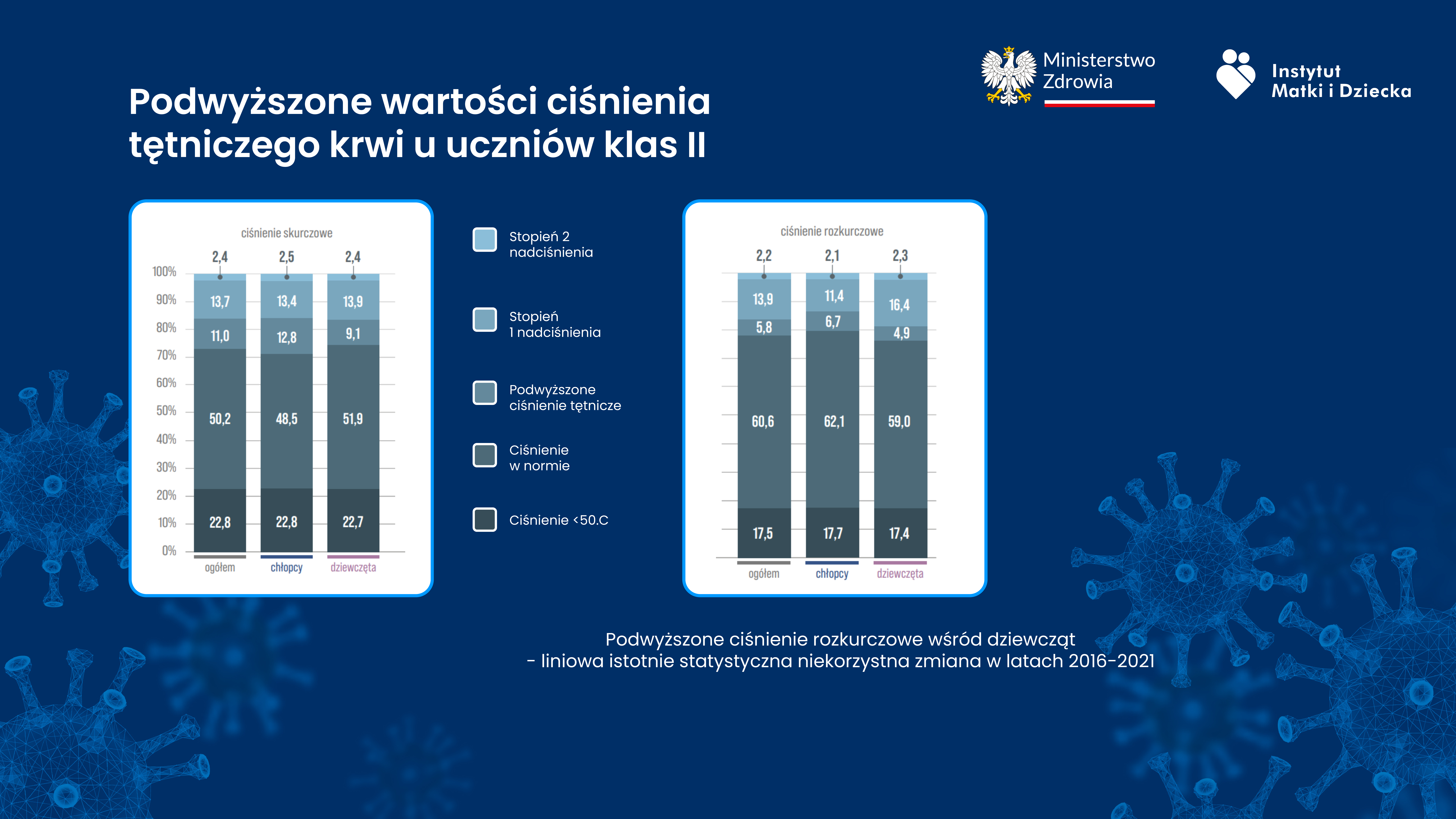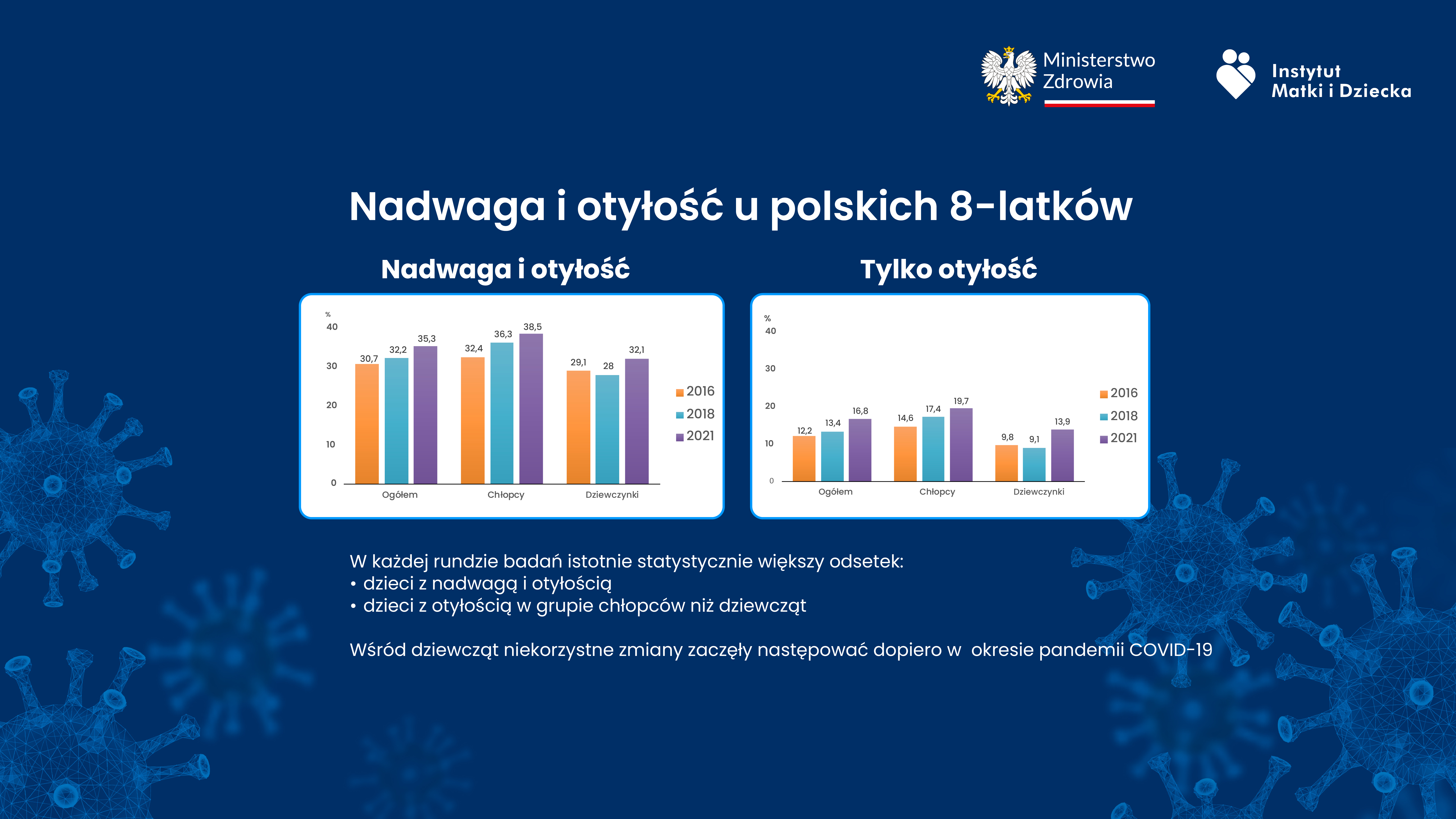 Z przeprowadzonych badań wynika, że liczba dzieci 8-letnich z nadwagą i otyłością zwiększyła się z 32,2% w 2018 roku do 35,3% w 2021 roku. Podwyższone wartości skurczowego ciśnienia tętniczego krwi występowały u 27,1% uczniów klas drugich, a rozkurczowego ciśnienia tętniczego krwi - u 21,9%. Cały raport z badań można znaleźć na stronie IMiD.