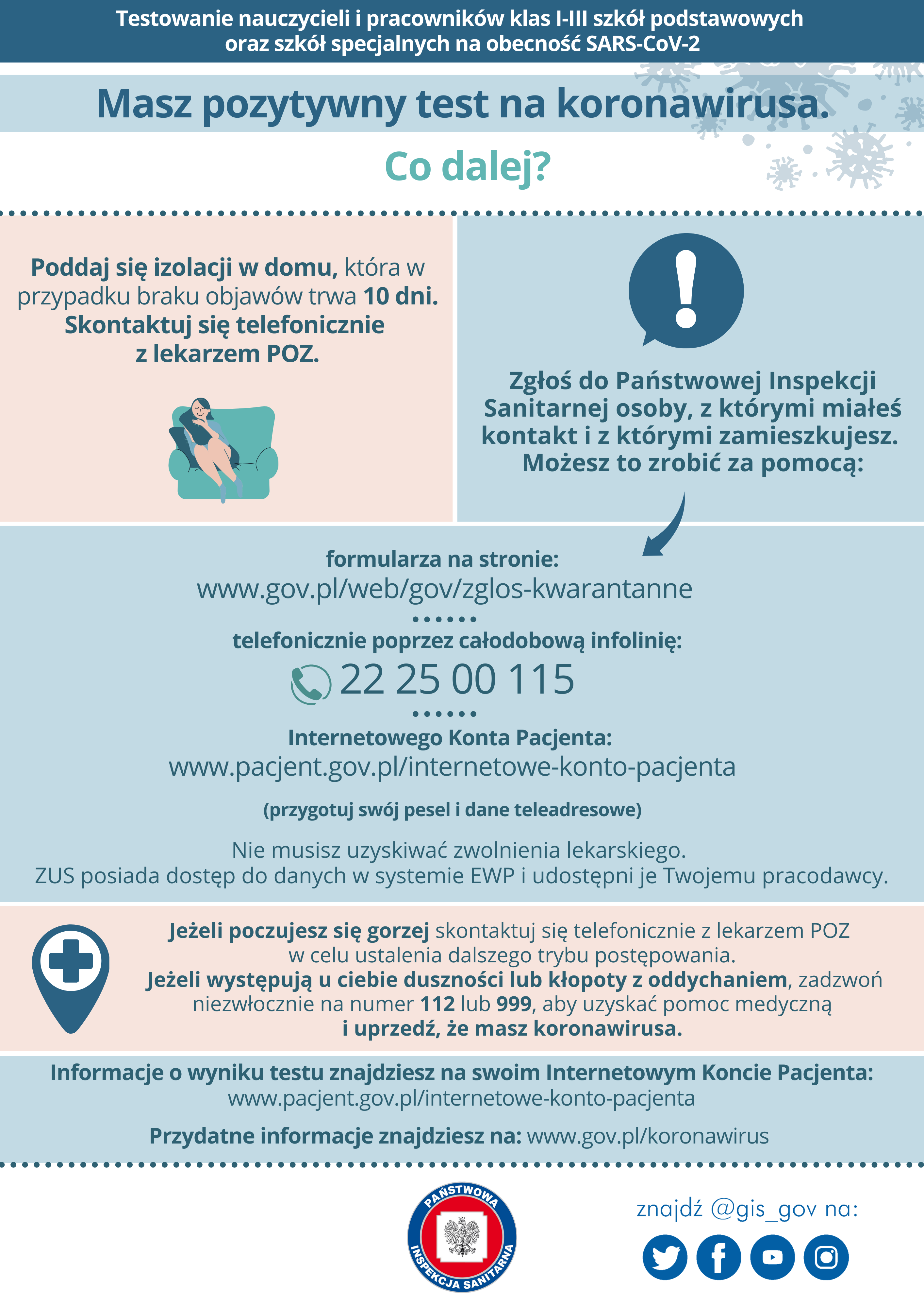 Osoby, które otrzymają pozytywny wynik testu na obecność SARS-Cov-2 muszą poddać się obowiązkowej 10. dniowej izolacji domowej (w przypadku braku objawów) oraz skontaktować się telefonicznie z lekarzem POZ. Konieczne będzie również zgłoszenie do Państwowej Inspekcji Sanitarnej osób z kontaktu. W tym celu można skorzystać z formularza zgłoszeniowego na stronie: https://www.gov.pl/web/gov/zglos-kwarantanne. Formularz zgłoszeniowy pozwala na szybki kontakt z inspekcją sanitarną i usprawnia przeprowadzenie wywiadu epidemiologicznego. Takiego zgłoszenia można dokonać także za pośrednictwem całodobowej infolinii sanepidu pod nr 22 25 00 115.