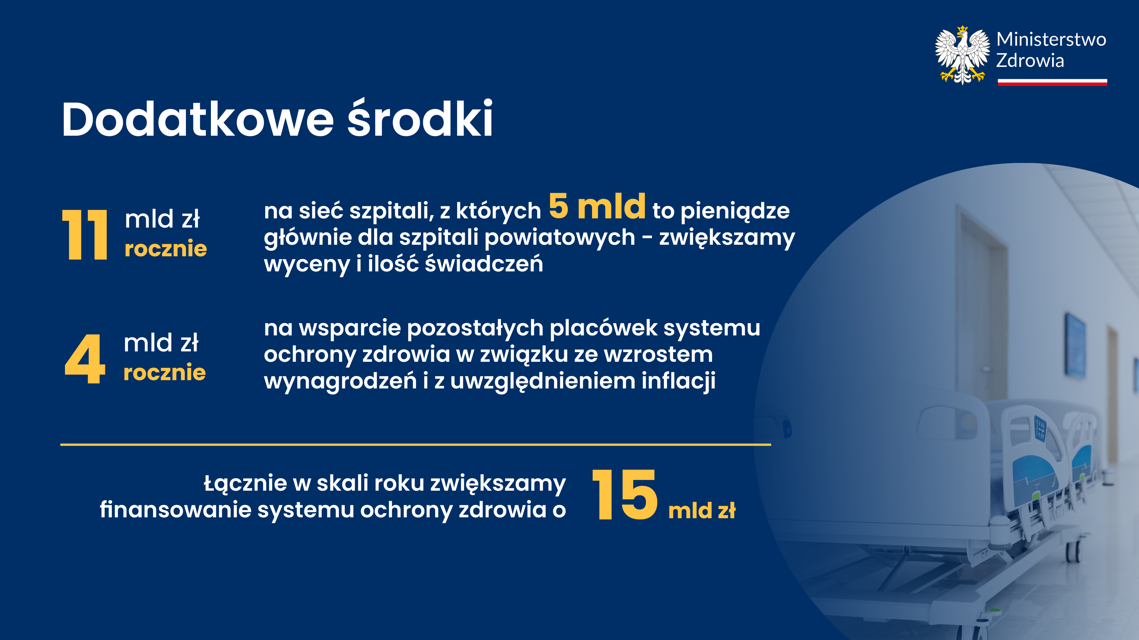 System opieki zdrowotnej zyska dodatkowo 15 mld zł rocznie. Na sieć szpitali trafi 11 mld zł, w tym 5 mld – w większości do szpitali powiatowych. Wsparcie pozostałych placówek w związku ze wzrostem wynagrodzeń wyniesie 4 mld rocznie.