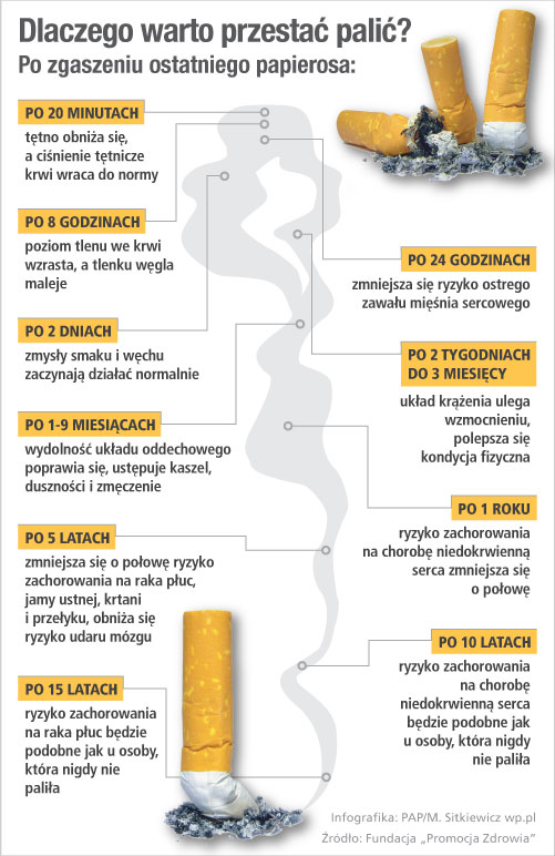 - 20 minut od zgaszenia ostatniego papierosa, puls i ciśnienie krwi wraca do normy.