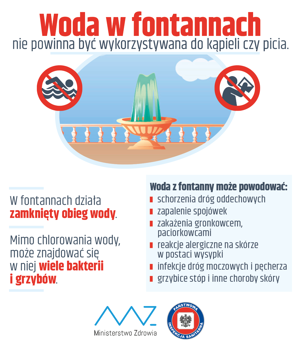 Epidemiolodzy ostrzegają, że w fontannach tradycyjnych, które mają obieg zamknięty, może znajdować się kilkadziesiąt różnych drobnoustrojów, m.in. bakterie gronkowca, salmonelli, pałeczki legionelli, bakterie kałowe np. Escheriachia coli, enterokoki. Mogą one powodować: