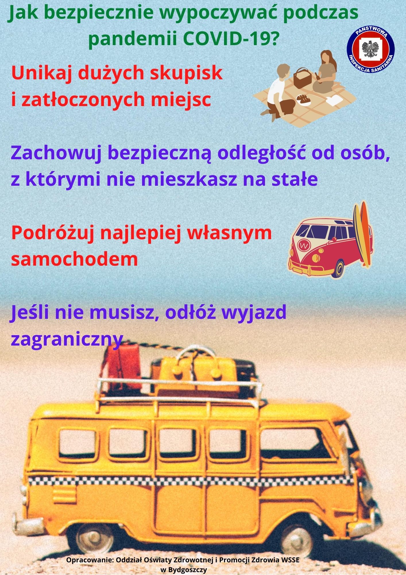 Państwowy Powiatowy Inspektor Sanitarny w Golubiu - Dobrzyniu w związku z trwającym okresem wakacyjnym, szczególnie związanym z wypoczynkiem dzieci i młodzieży, przypomina o zachowaniu odpowiednich zasad bezpieczeństwa i higieny. Jednocześnie informuje, że pandemia nadal trwa, a wirus SARS-CoV-2 wciąż jest niebezpieczny. Zachowajmy czujność i bądźmy odpowiedzialni. Zakrywajmy nos i usta w zamkniętych pomieszczeniach, trzymajmy dystans oraz dezynfekujmy ręce.