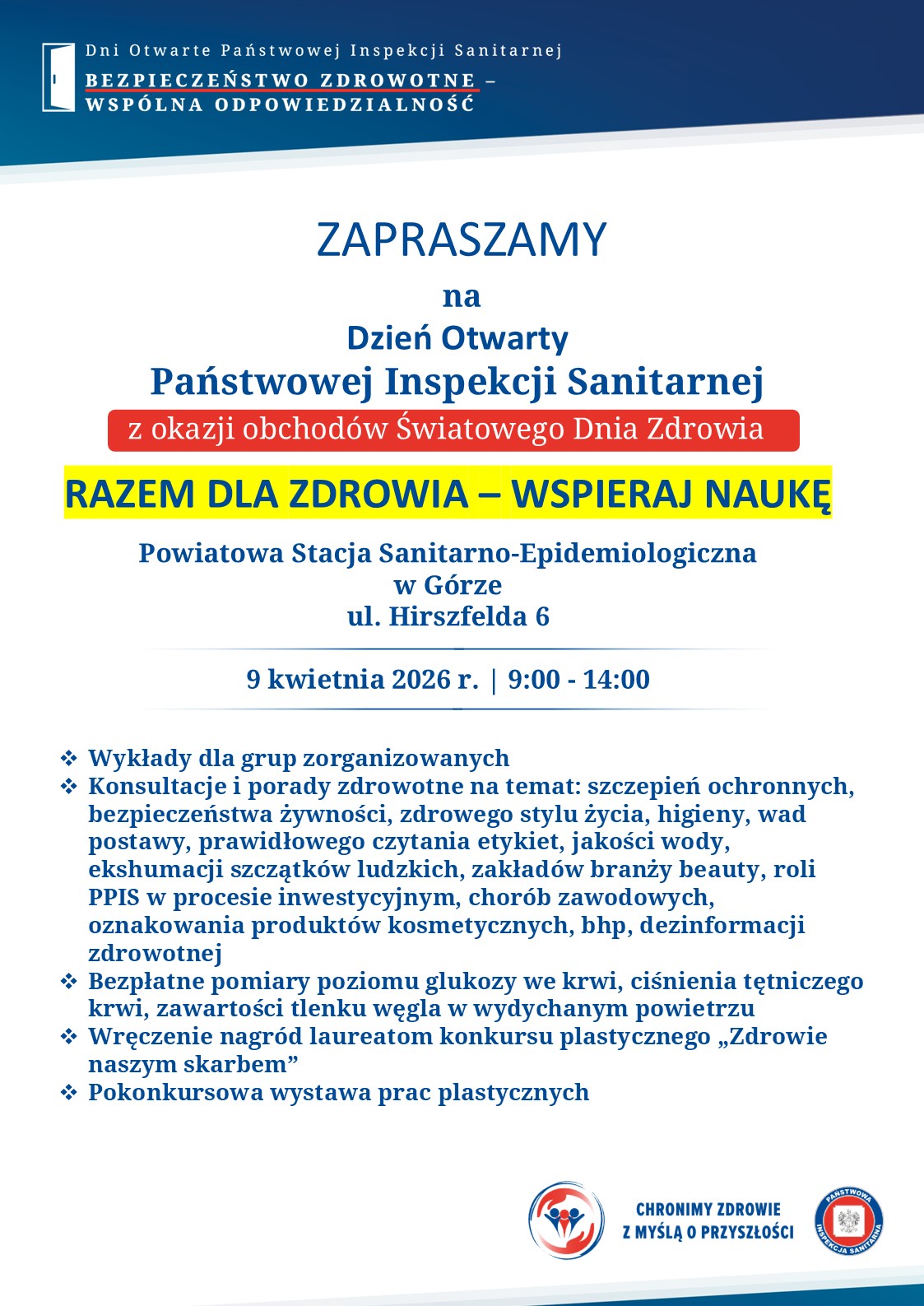 Z okazji obchodów Światowego Dnia Zdrowia, Państwowy Powiatowy Inspektor Sanitarny w Górze zaprasza do udziału w Dniach Otwartych Państwowej Inspekcji Sanitarnej, które odbędą się w dniu 9 kwietnia 2026 r. pod hasłem: „Bezpieczeństwo zdrowotne – wspólna odpowiedzialność”, w siedzibie Powiatowej Stacji Sanitarno-Epidemiologicznej w Górze.