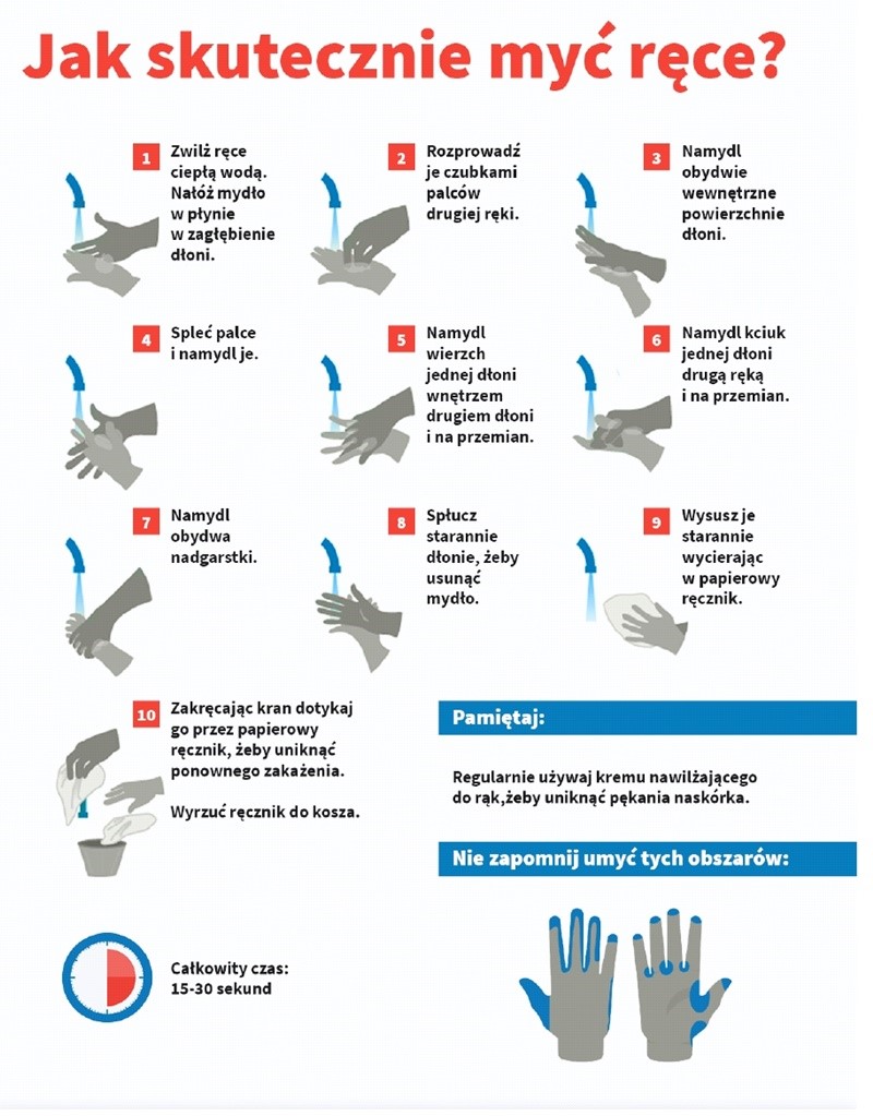 - na koniec dokładnie opłukać ręce wodą i wytrzeć ręce do sucha jednorazowym ręcznikiem