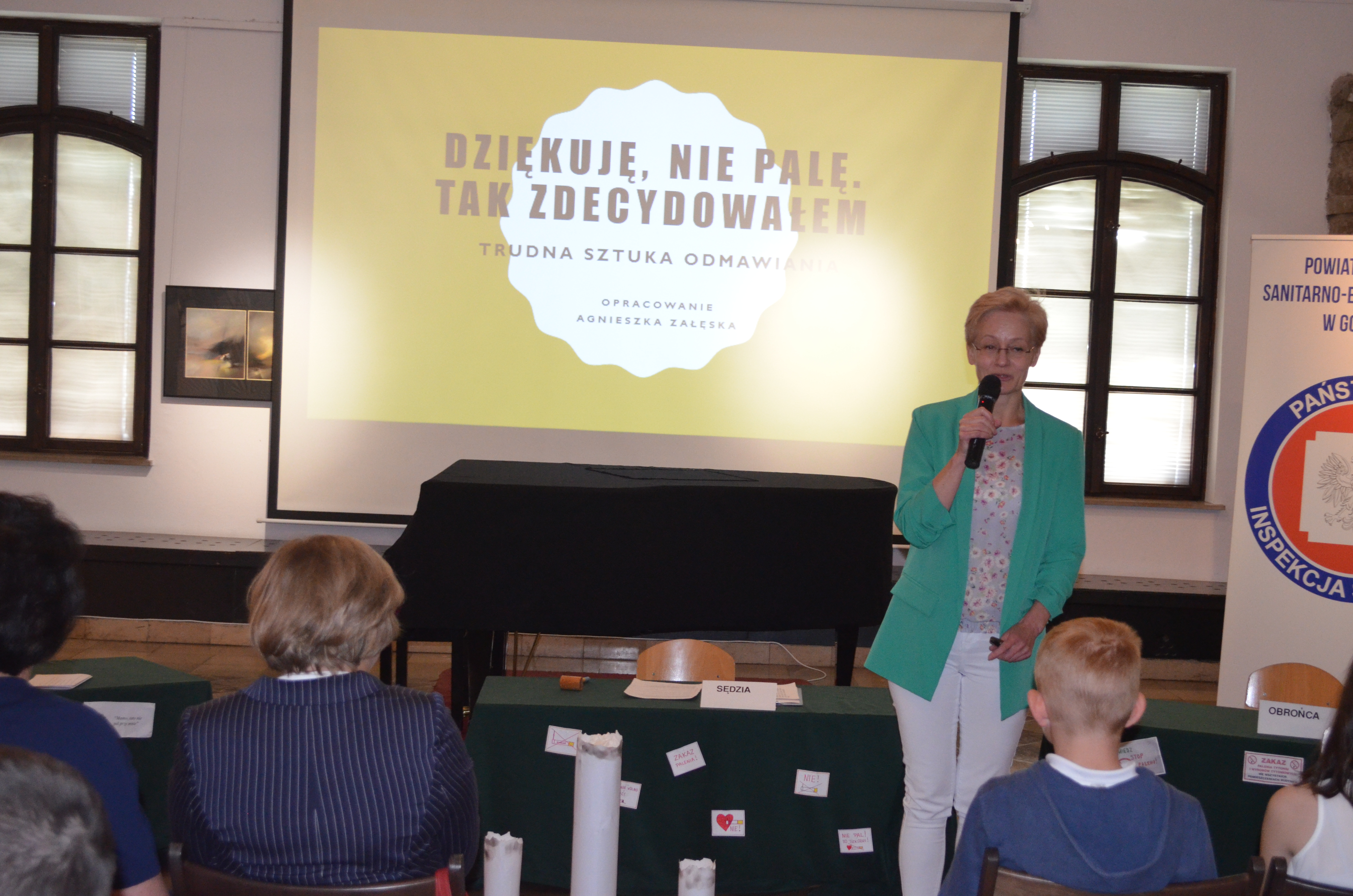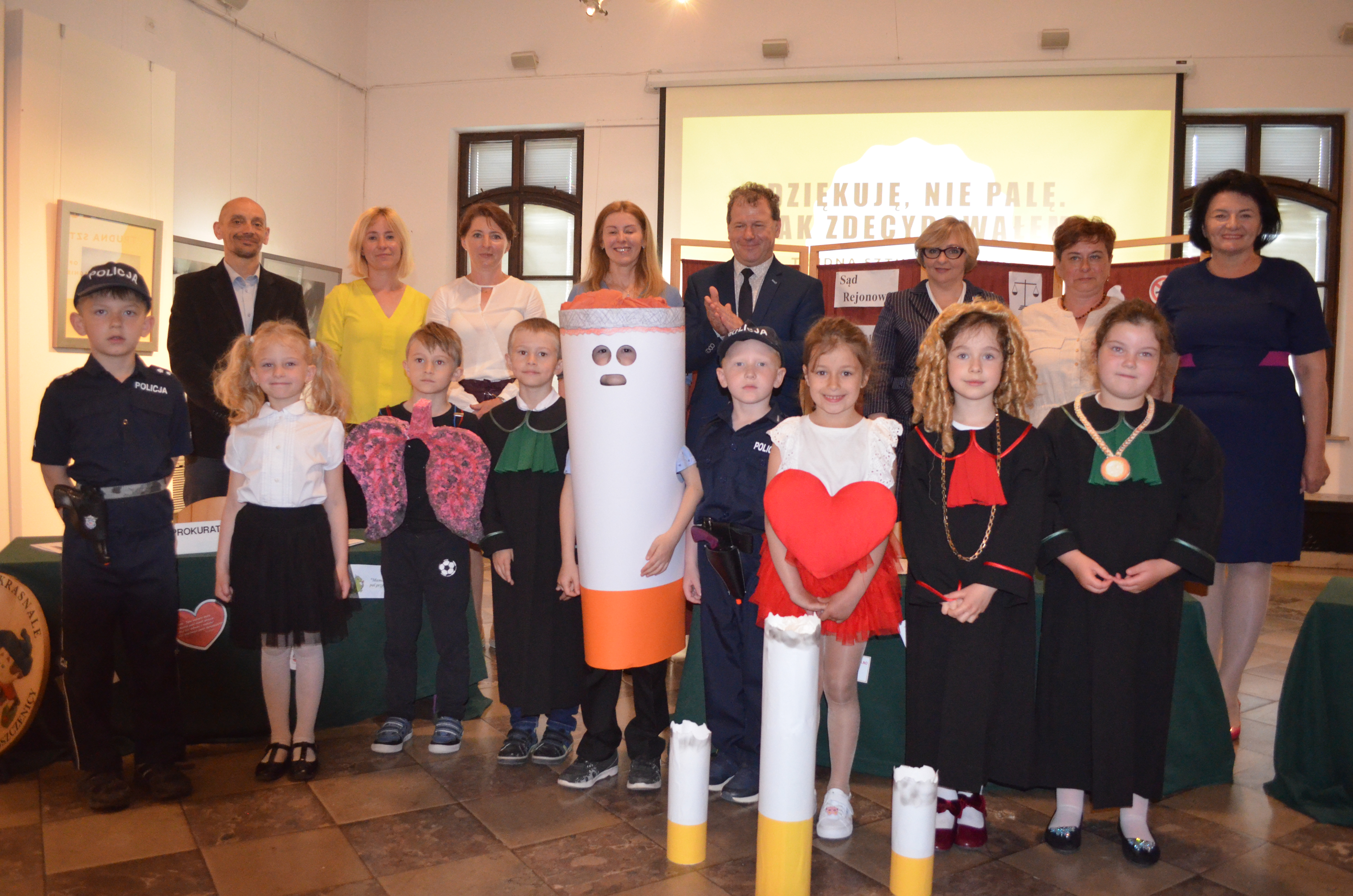 Ogłoszenie wyników konkursu było jednym z punktów programu akcji profilaktycznej pt. „BEZ DYMU DO CELU” skierowanej do uczniów klas IV uczestniczących w programie „BIEG PO ZDROWIE”. W ramach akcji uczestnicy mieli okazję wysłuchać wykładów Pana Marka Szczotkowskiego – psychoedukatora, specjalisty ds. nieletnich oraz Pani Agnieszki Zielińskiej – pedagoga reprezentującego Poradnię Psychologiczno-Pedagogiczną w Gorlicach, obejrzeć inscenizację pt. „Sąd nad papierosem” w wykonaniu przedszkolaków z Samorządowego Przedszkola „Wesołe Krasnale” w Moszczenicy, wysłuchać utworu Amy Winehouse w wykonaniu niezwykle utalentowanej Emilii Cisowskiej – podopiecznej Gorlickiego Centrum Kultury oraz rymowanek antytytoniowych deklamowanych przez swoich rówieśników ze szkół podstawowych w: Bobowej, Bystrej, Strzeszynie, Stróżówce i Dominikowicach.