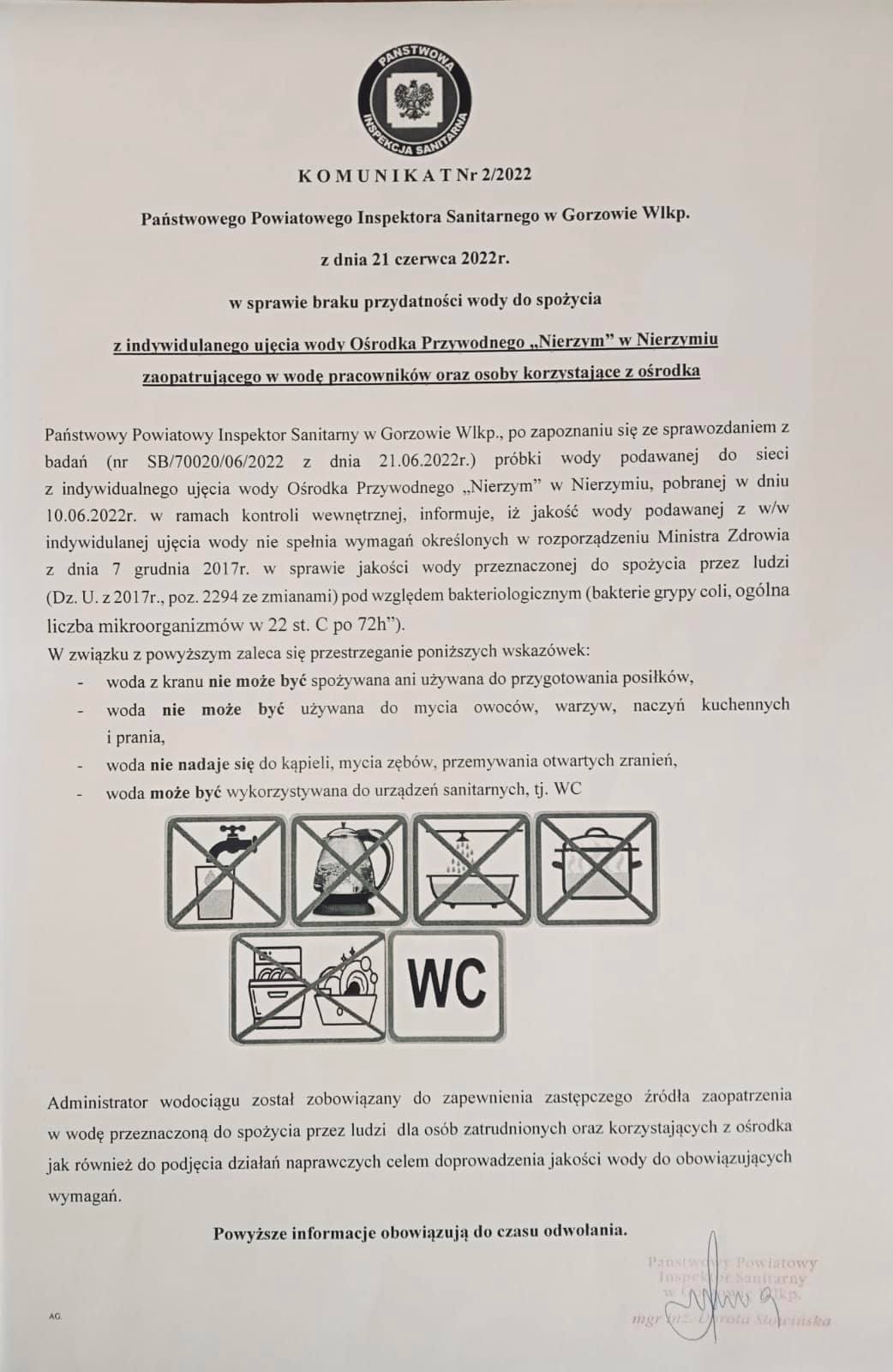 - w sprawie braku wody do spożycia z indywidualnego ujęcia wody Ośrodka Przywodnego „Nierzym” w Nierzymiu.
