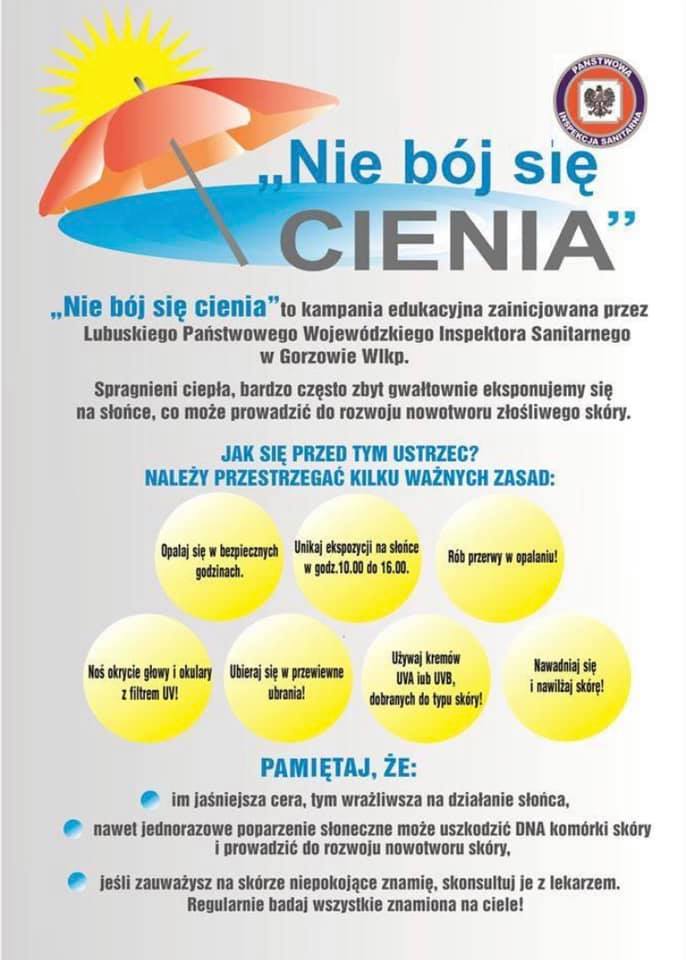 Ruszyła kampania edukacyjna „ Nie bój się cienia” zainicjowana przez Lubuskiego Państwowego Wojewódzkiego Inspektora Sanitarnego w Gorzowie Wlkp., której celem jest informowanie społeczeństwa o skutkach nadmiernego narażenia się na promieniowanie UV.