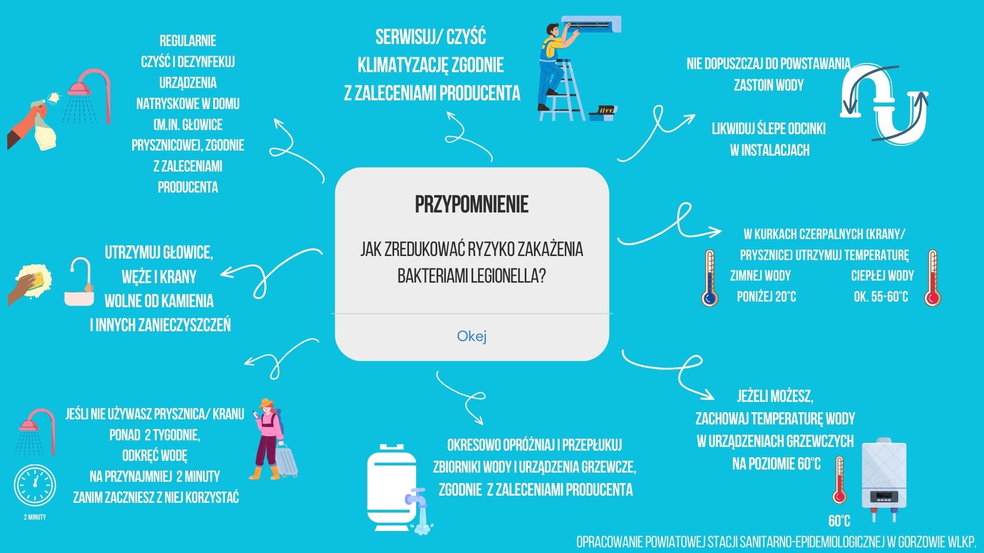 - regularnie przeprowadzaj wizualną kontrolę stanu technicznego swojej instalacji, armatury, przewodów, zbiorników, a także regularnie czyść i dezynfekuj urządzenia natryskowe (głowice prysznicowe, nawilżacze powietrza, wanny z hydromasażem) zgodnie z zaleceniami producenta