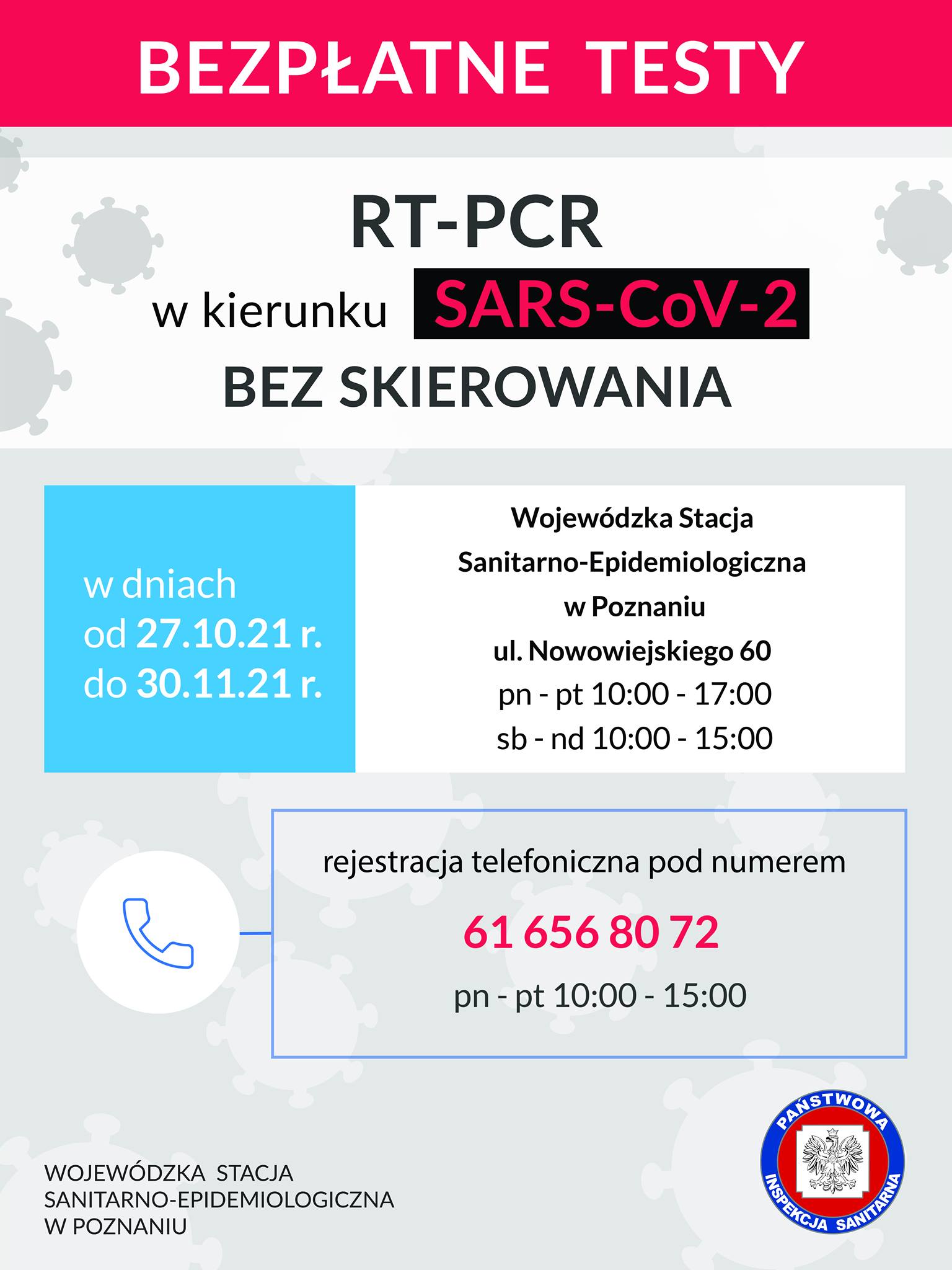 Państwowy Powiatowy Inspektor Sanitarny w Gostyniu informuje, iż w dniach od 27.10.2021r. do 30.11.2021r. w Wojewódzkiej Stacji Sanitarno-Epidemiologicznej w Poznaniu przy ul. Nowowiejskiego 60 odbędą się bezpłatne testy w kierunku SARS-CoV-2 bez skierowania. Testy odbędą się w godzinach: poniedziałek – piątek 10.00 -17.00, sobota – niedziela 10.00-15.00. Rejestracja telefoniczna pod numerem 61 656 80 72 od poniedziałku do piątku w godzinach 10:00-15:00.
