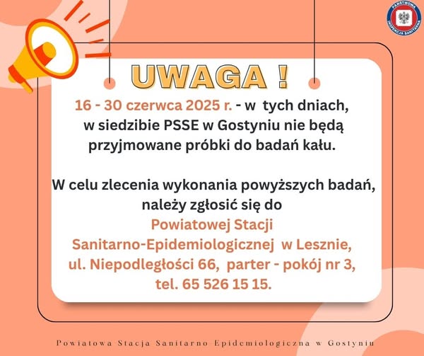 Uwaga! 16-30 czerwca 2025 r. - PSSE w Gostyniu nie przyjmuje próbek do badania kału