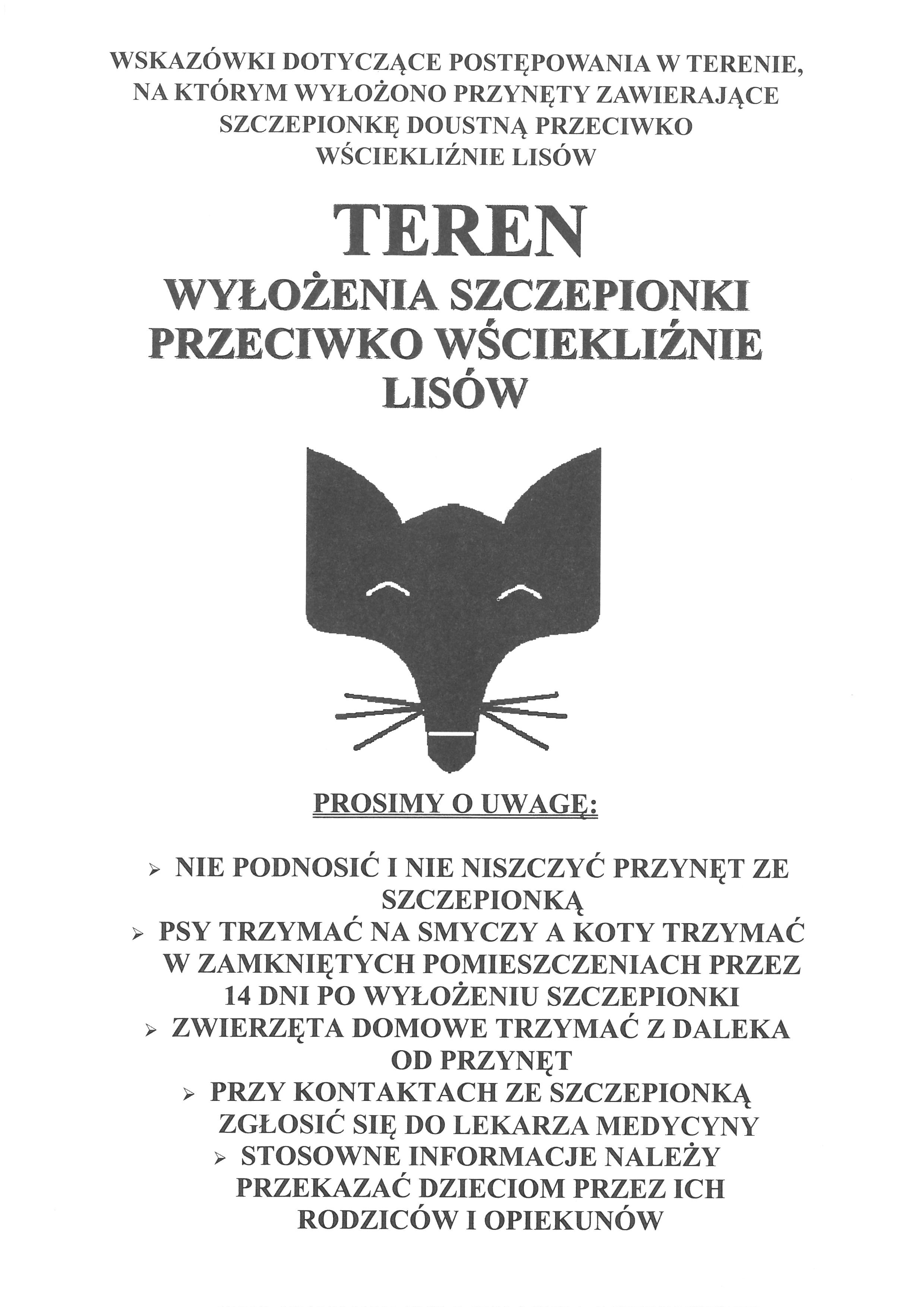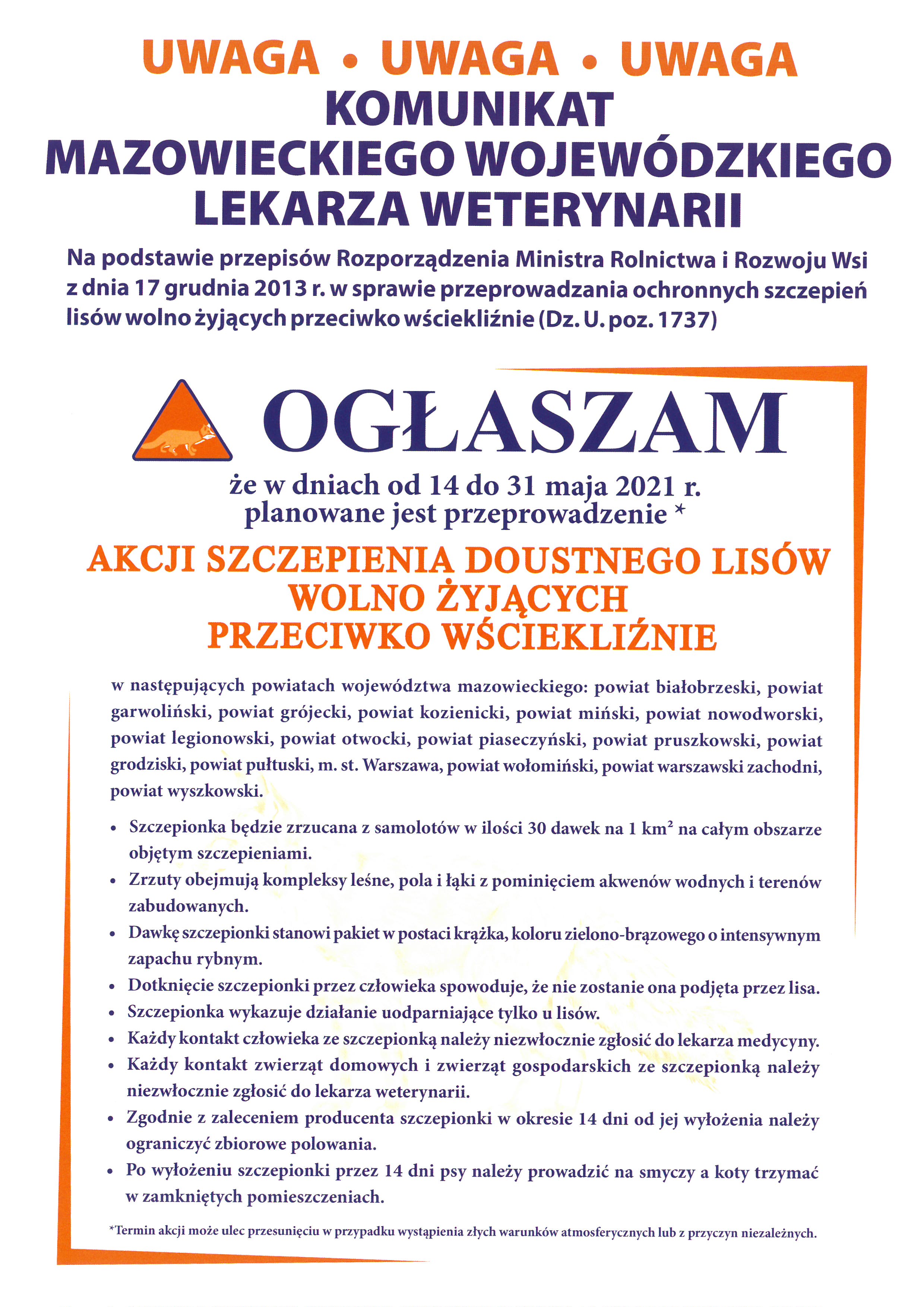 Powiatowa Stacja Sanitarno - Epidemiologiczna w Grodzisku Mazowieckim informuje, że w terminie 14.05 – 31.05.2021r. realizowana będzie akcja szczepień doustnych lisów wolno żyjących przeciwko wściekliźnie. Akcja rozpylania preparatu obejmie kompleksy leśne, łąki i pola. Mając na uwadze zdrowie Państwa oraz bezpieczeństwo Państwa pupili, prosimy o zapoznanie się z zasadami i wskazówkami postępowania oraz o poinformowaniu rodziny i znajomych o realizowanej akcji.