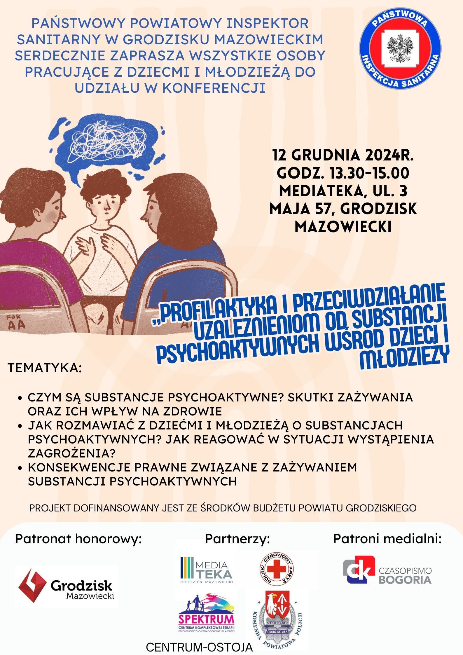 PPIS w Grodzisku Mazowieckim zaprasza dyrektorów oraz nauczycieli ze szkół podstawowych i przedszkoli na konferencję pt. "PROFILAKTYKA I PRZECIWDZIAŁANIE UZALEŻNIENIOM OD SUBSTANCJI PSYCHOAKTYWNYCH WŚRÓD DZIECI I MŁODZIEŻY". która odbędzie się w Mediatece, przy ul. 3 Maja 57 w Grodzisku Mazowieckim w dniu 12 grudnia 2024. o godz. 13:30.