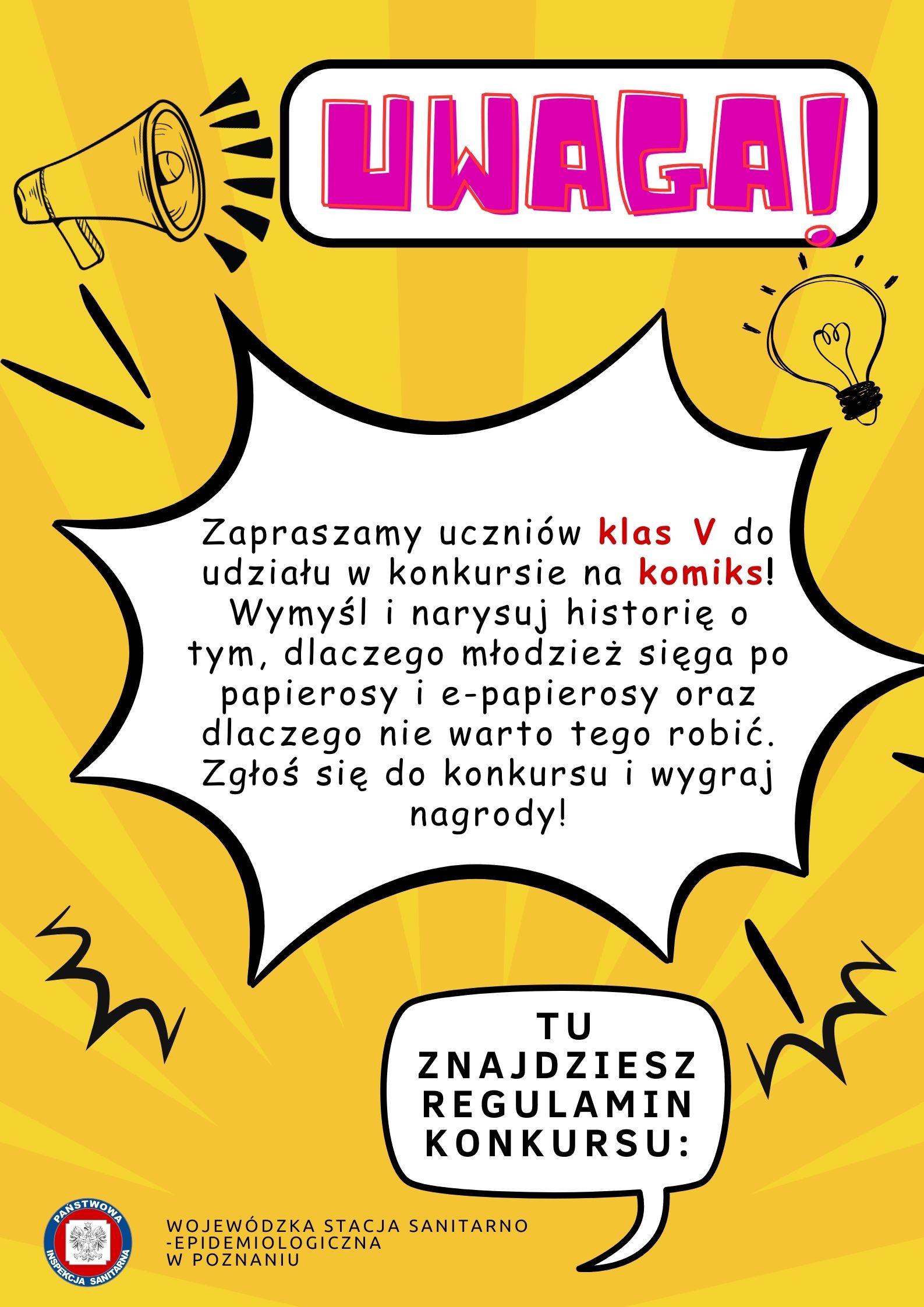 Zapraszamy uczniów klas V szkół podstawowych do udziału w konkursie na komiks pt.: „Palić, nie palić–oto jest pytanie?”. Tegoroczne zadanie polega na wymyśleniu i narysowaniu historii opowiadającej o tym, dlaczego młodzież sięga po papierosy, e-papierosy i inne wyroby tytoniowe oraz dlaczego nie warto tego robić. Praca może zostać wykonana w różnych technikach takich jak: rysunek, malarstwo, grafika z uwzględnieniem samodzielnie wykonanej grafiki komputerowej (bez użycia gotowych komponentów). Komiksy mogą być czarno-białe lub kolorowe, wykonane na sztywnym papierze, w pionowym formacie A5, minimum 2 okienka na stronę, minimum 4 strony.