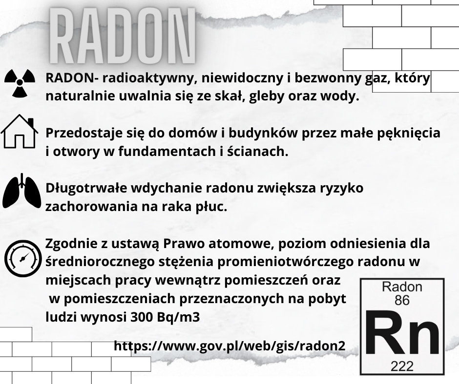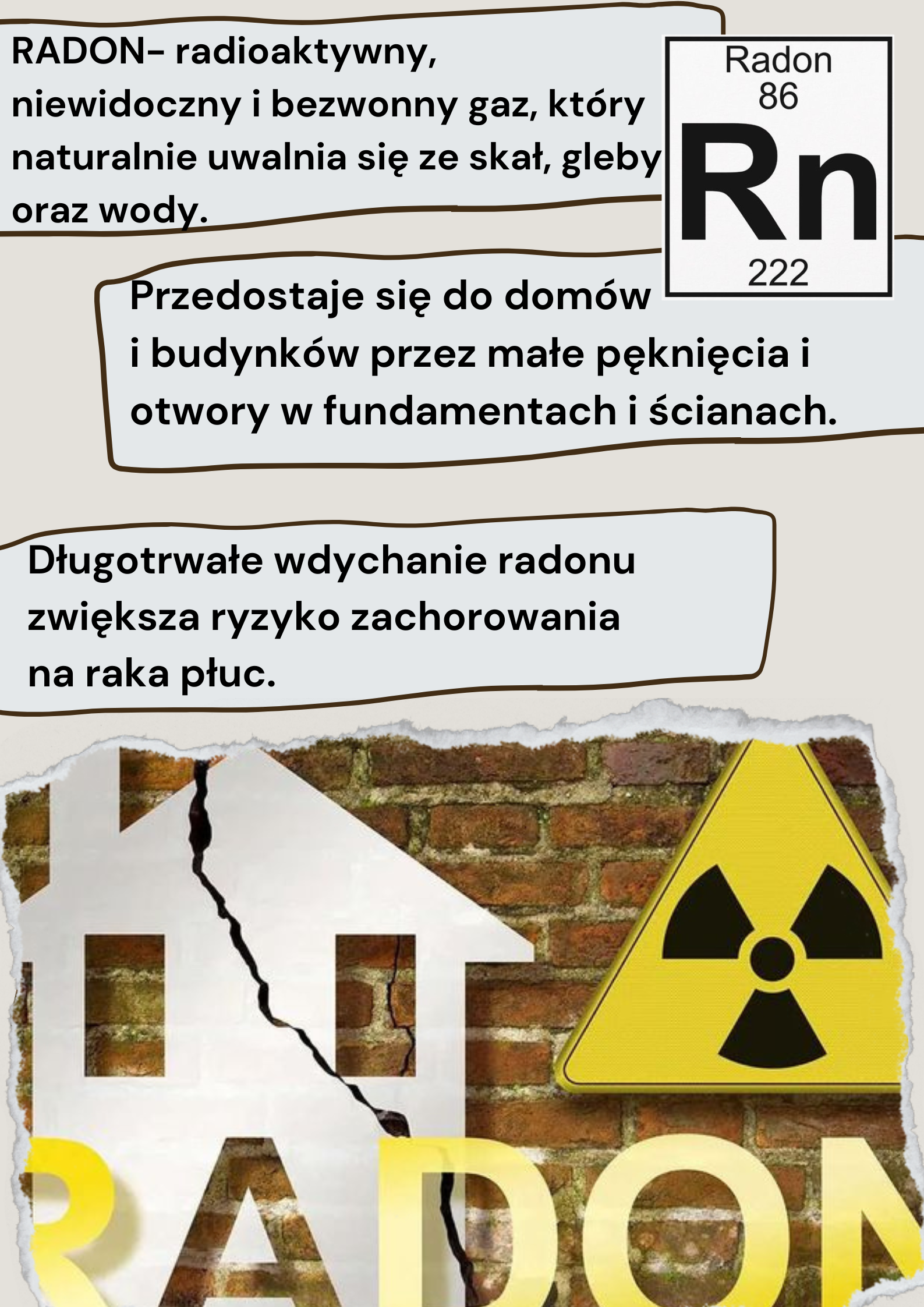 Radon jest gazem promieniotwórczym powszechnie występującym naturalnie w środowisku: w podłożu gruntowym, wodzie i powietrzu. Powstaje w wyniku promieniotwórczego rozpadu