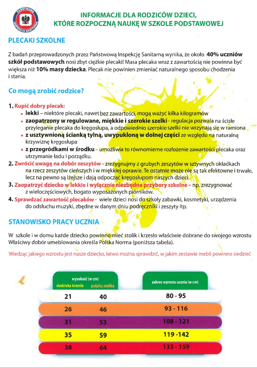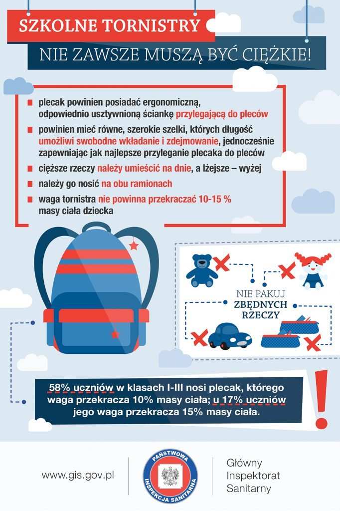 Zgodnie z zaleceniami Głównego Inspektora Sanitarnego waga plecaka nie powinna przekraczać 10-15 proc. masy ciała ucznia.