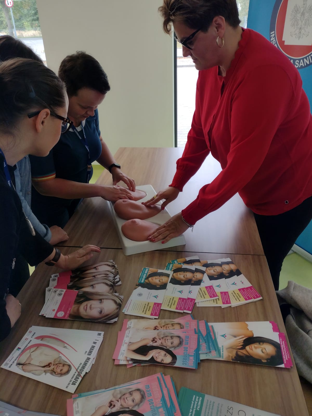 Podczas spotkania przedstawiono prezentację multimedialną na temat profilaktyki raka piersi, instruktaż dot. samobadania oraz prowadzono ćwiczenia z wykorzystaniem fantomu do samobadania piersi.