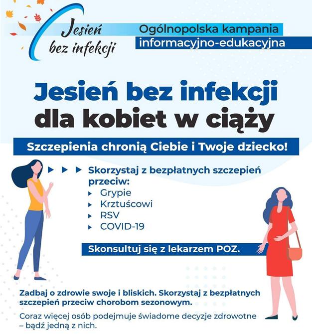 Szczepienia zalecane bezpłatne dla kobiet w ciąży (w odniesieniu do chorób infekcyjnych nasilających się w sezonie jesienno-zimowym) to: grypa, krztusiec, RSV i COVID-19.