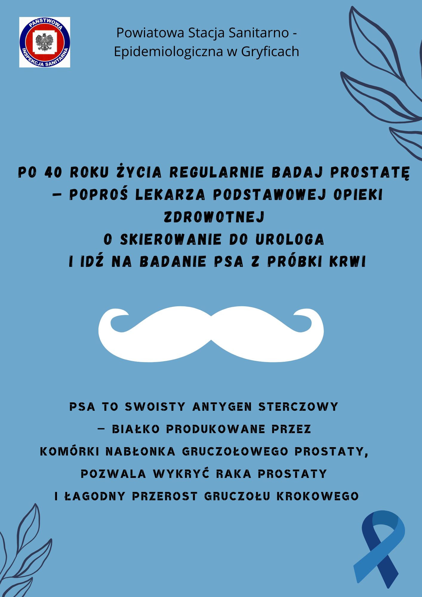 - po 40 roku życia regularnie badaj prostatę – poproś lekarza podstawowej opieki zdrowotnej (POZ) o skierowanie do urologa i idź na badanie PSA z próbki krwi. PSA (ang. Prostate Specific Antigen) to swoisty antygen sterczowy – białko produkowane przez komórki nabłonka gruczołowego prostaty, pozwala wykryć raka prostaty i łagodny przerost gruczołu krokowego.