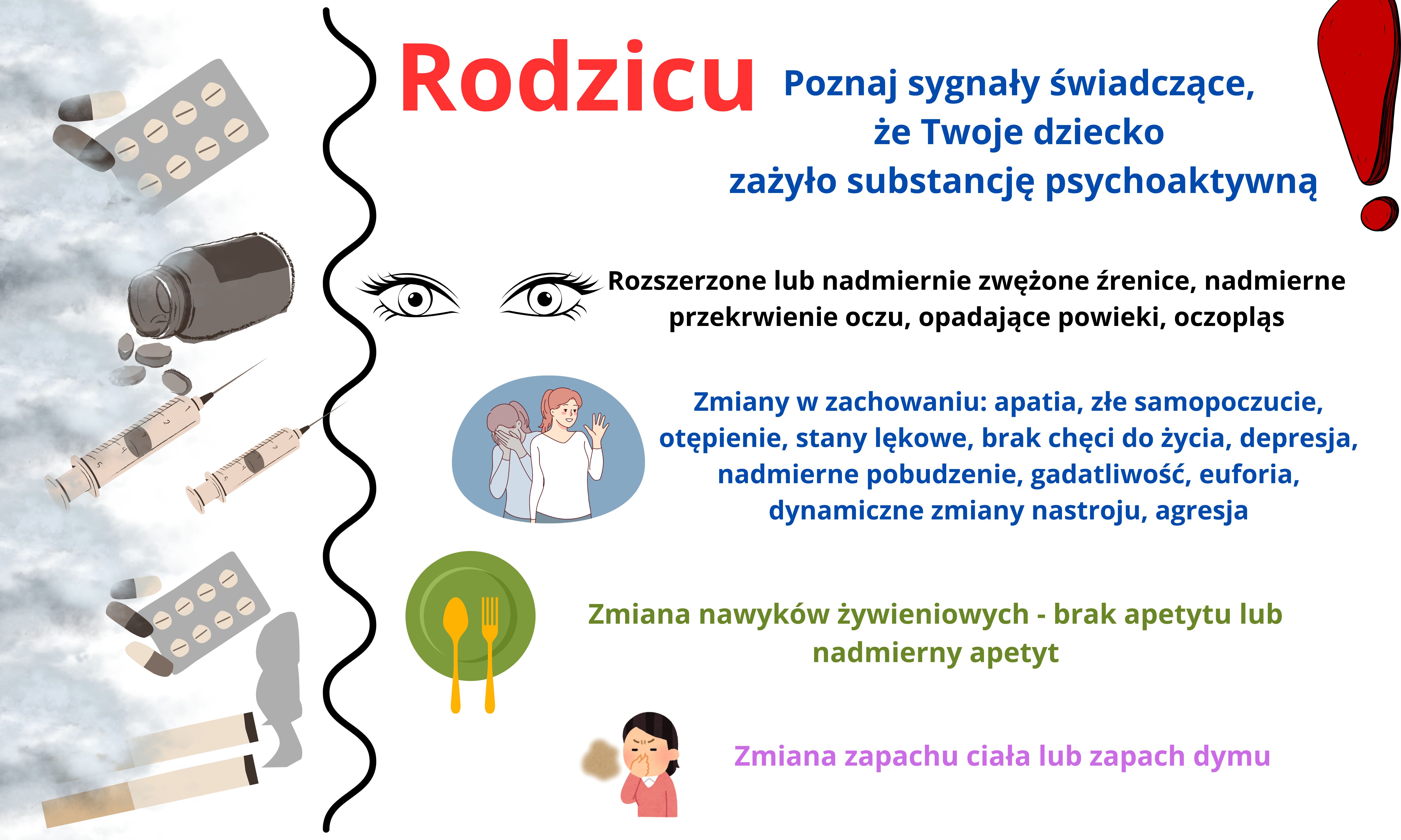 Jednym z sygnałów świadczących, że dziecko przyjmuje tego rodzaju substancje jest pojawienie się wśród rzeczy dziecka nowych przedmiotów i produktów mogących służyć do przyjmowania substancji psychoaktywnych np. fifki, zapalniczki, łyżeczki, bibułki, kawałki okopconej folii aluminiowej, igły i strzykawki, waciki, paczuszki w foliowych opakowaniach, kleje, tabletki, proszek, sproszkowane zioła, bryłki itp.