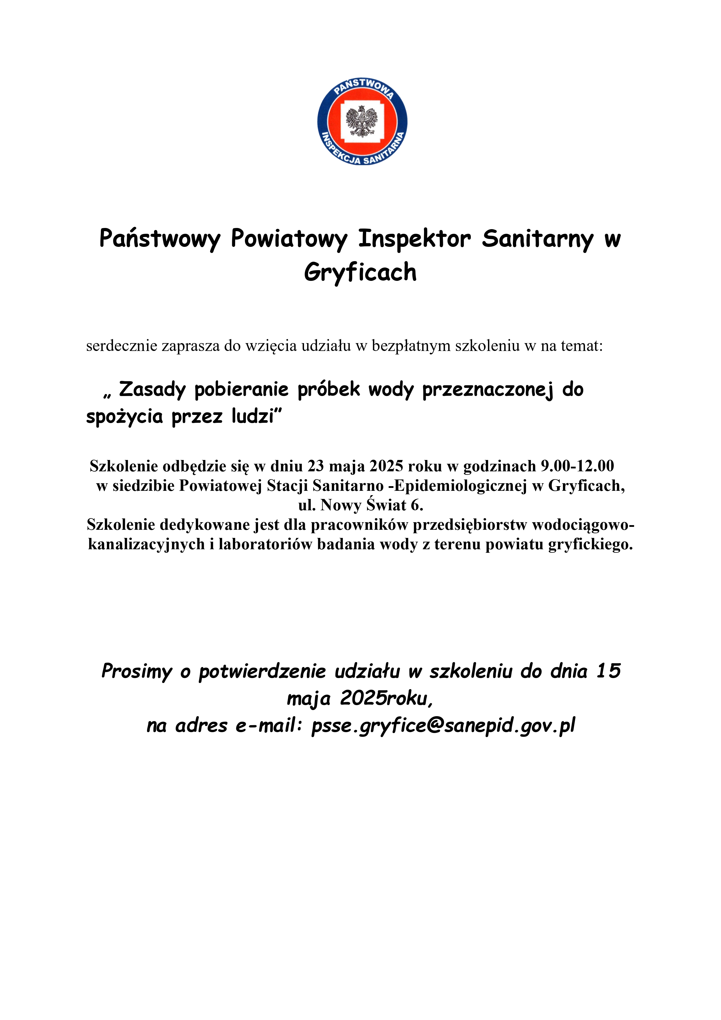 Państwowy Powiatowy Inspektor Sanitarny w Gryficach serdecznie zaprasza do wzięcia udziału w bezpłatnym szkoleniu