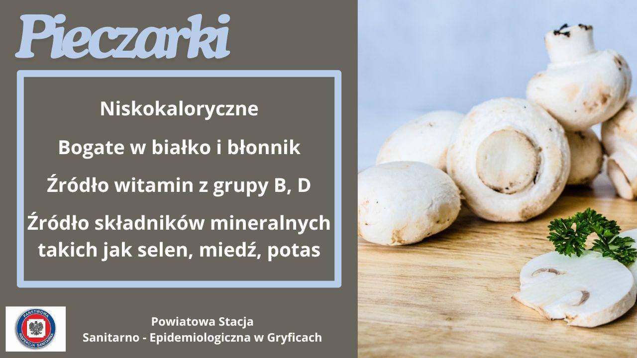 Pieczarki są niskokaloryczne, w 90-95% składają się z wody, w 100 g świeżej masy zawierają około 3 g białka, 0,3 g tłuszczu i 3 g węglowodanów. Zawierają dużo witamin m.in. z grupy B, a także składników mineralnych takich jak selen, miedź, potas. Badania naukowe potwierdzają przeciwnowotworowe, odpornościowe, antybakteryjne właściwości pieczarek. Warto włączyć pieczarki do codziennej diety.