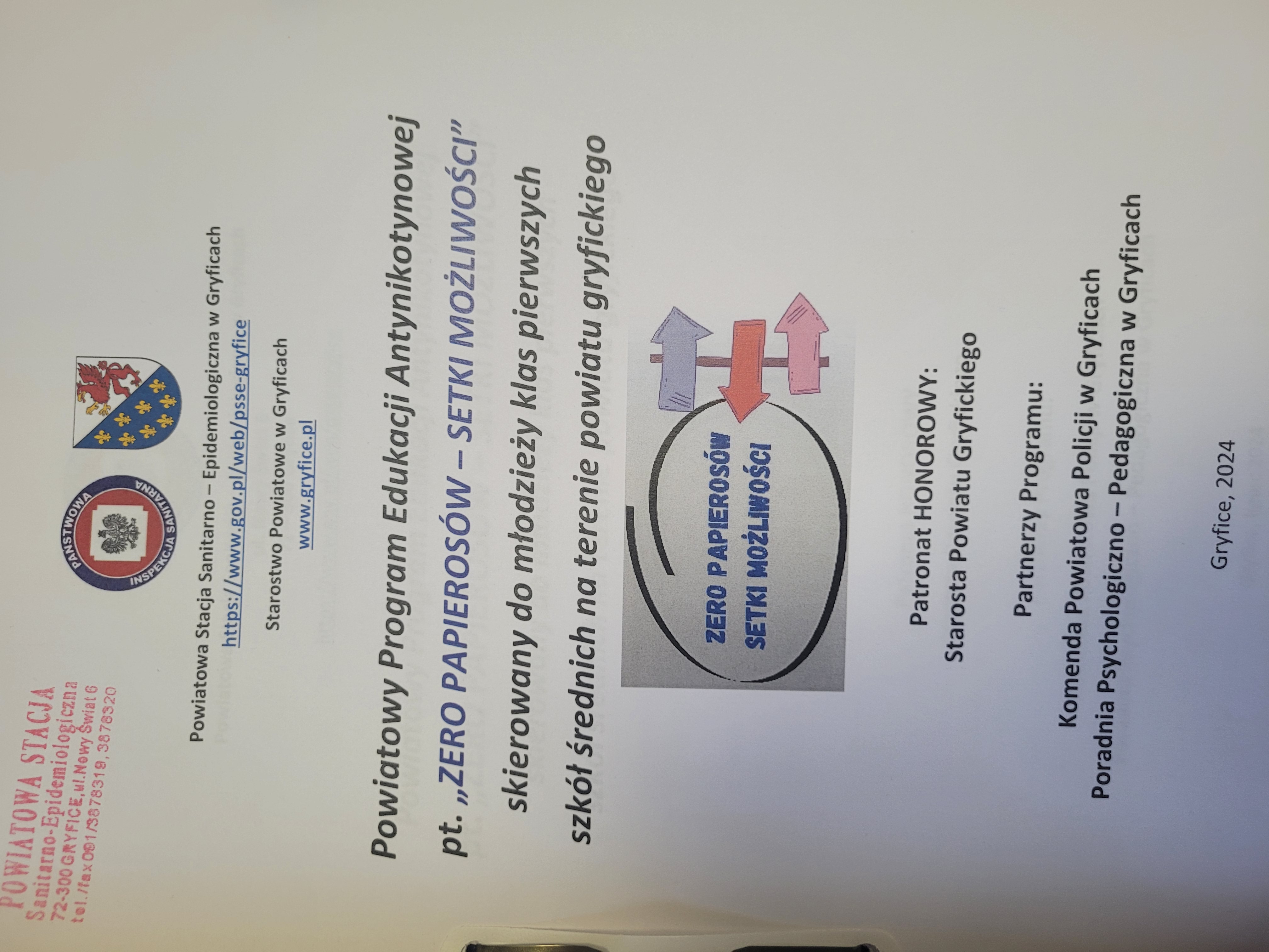 W roku szkolnym 2024 / 2025 w klasach pierwszych szkół średnich na terenie powiatu gryfickiego rozpoczynamy realizację Powiatowego Programu Edukacyjnego pt. „Zero Papierosów – Setki Możliwości”.