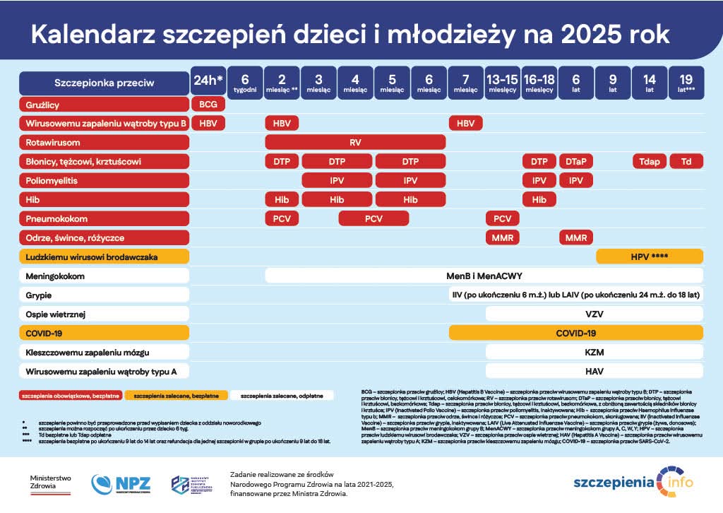 Zachęcamy do zapoznania się z aktualnym kalendarzem szczepień ochronnych dzieci i młodzieży na 2025 r.