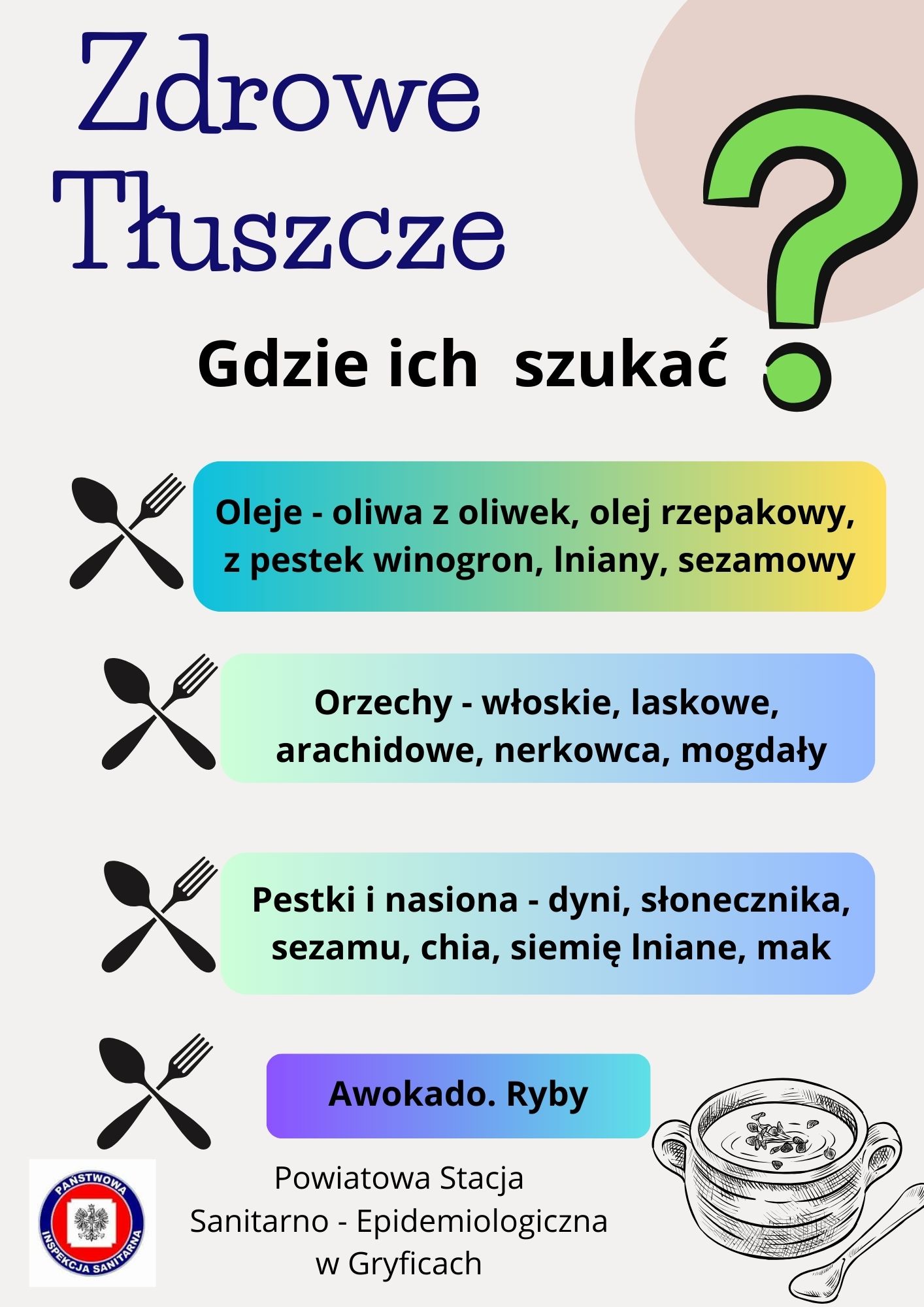 Nie można zapominać, że tłuszcze to produkty wysokoenergetyczne, stanowiące o kaloryczności potraw. Z tego względu ich ilość musi być indywidualnie dopasowana. Badania spożycia pokazują, że ponad 50% spożywanego tłuszczu stanowi tzw. tłuszcz ukryty, występujący w produktach, lecz niewidoczny na pierwszy rzut oka, np. żółte sery czy śmietana. Natomiast tłuszcze widoczne to oleje roślinne i miękkie margaryny (zalecane do spożycia) oraz masło, smalec, tłuszcz w mięsie i wędlinach. Zaleca się spożywanie tłuszczów roślinnych, w tym olejów: rzepakowego, słonecznikowego, sojowego a także oliwy z oliwek oraz miękkich margaryn.