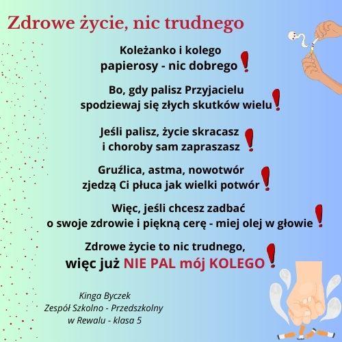 Laureatem konkursu została Kinga Byczek z klasy 5 Zespołu Szkolno – Przedszkolnego w Rewalu za autorski wiesz pt. „Zdrowe życie nic trudnego”.