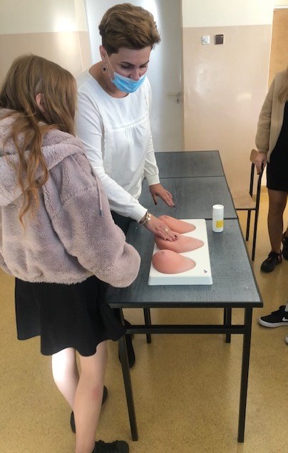 Podczas zajęć młodzież miała okazję skorzystać z fantomu do samobadania piersi i wyczuć podczas dotyku jak wygląda pierś chora ze znacznymi zmianami oraz zmianami łagodnymi.
