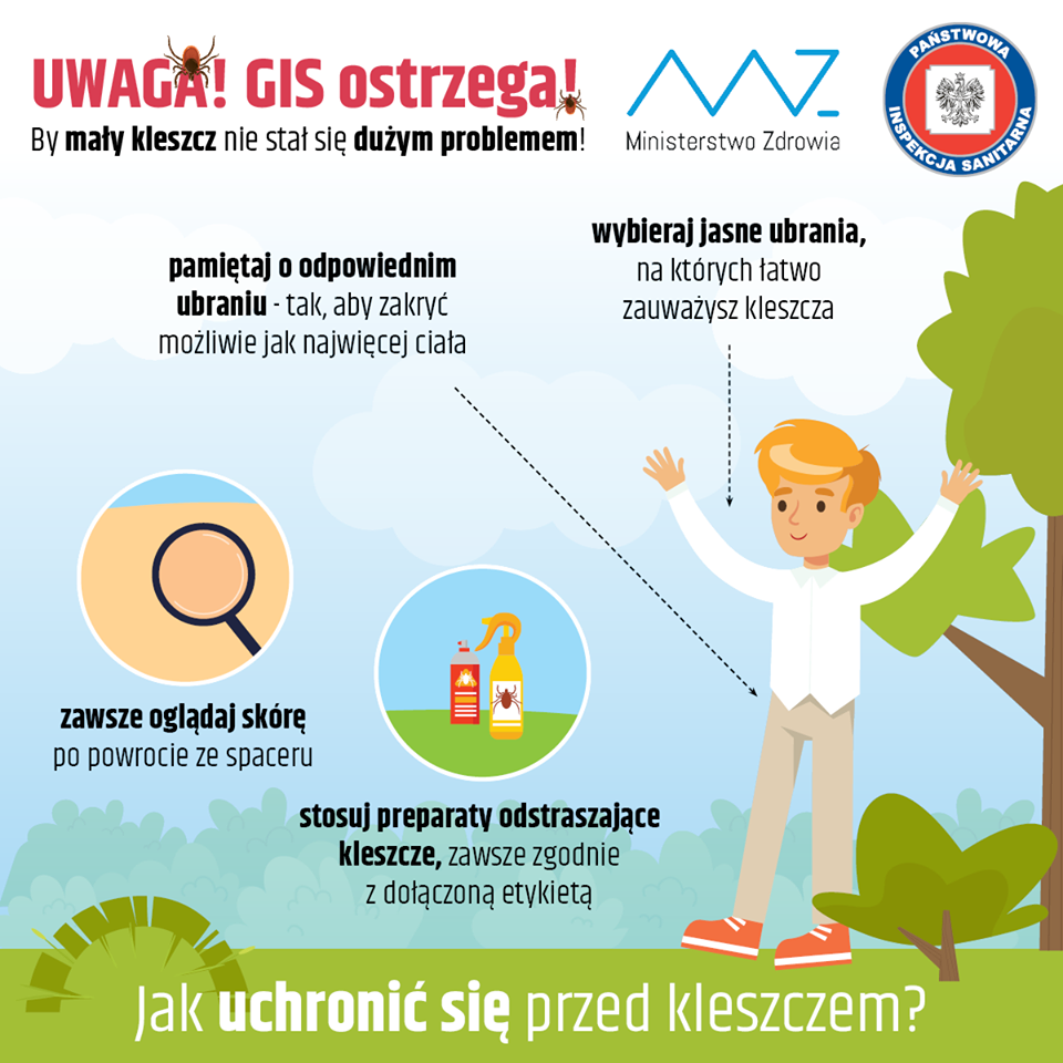 Wiosna i miesiące letnie sprzyjają częstszemu korzystania z form wypoczynku na świeżym powietrzu w parkach i lasach oraz noszeniu lżejszego ubioru, zwiększają równocześnie ryzyko pokąsania przez kleszcze mogące przenosić groźne dla zdrowia, bakterie, wirusy i pierwotniaki.