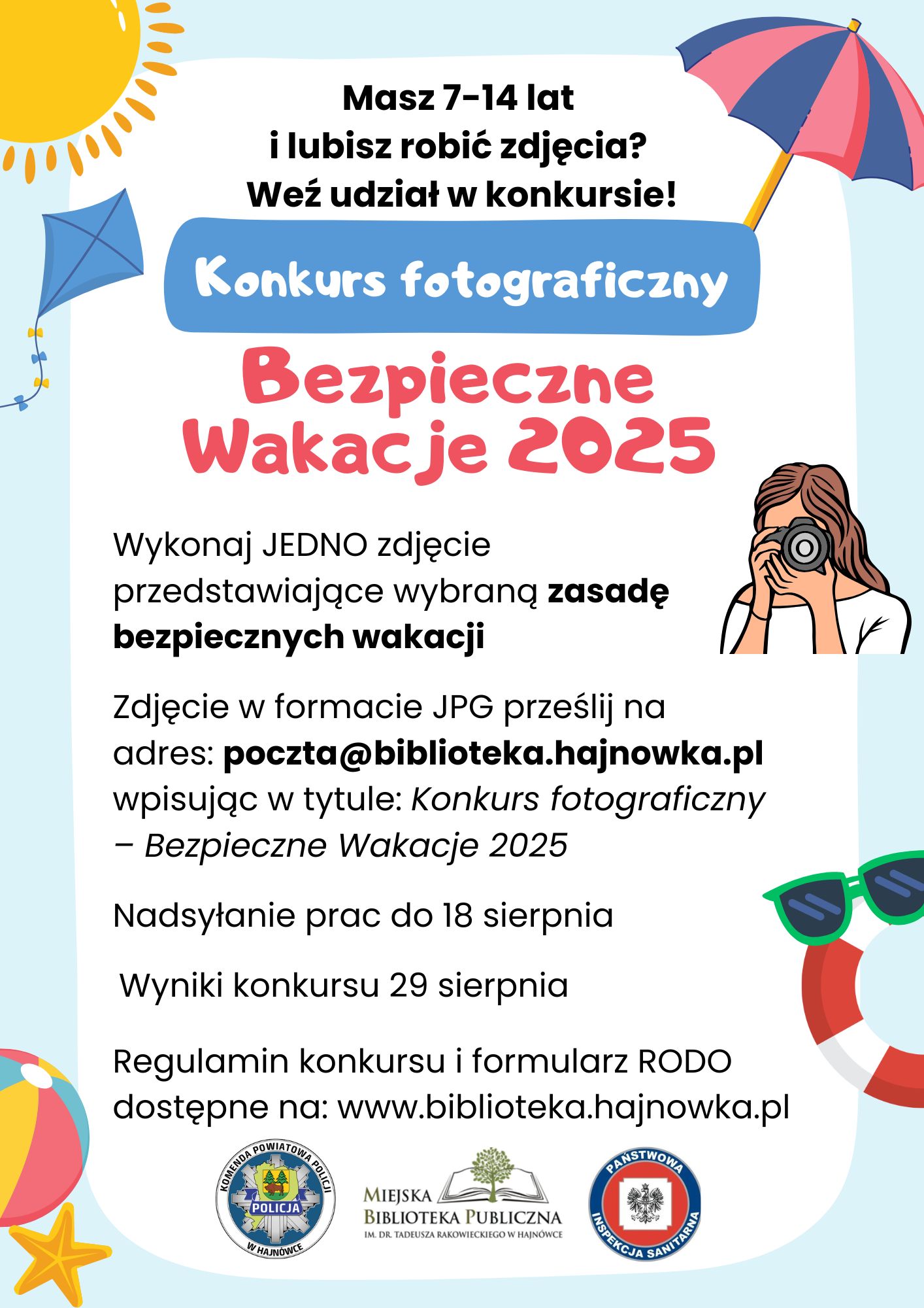 Państwowy Powiatowy Inspektor Sanitarny w Hajnówce zaprasza do udziału w konkursie fotograficznym pn.: „Bezpieczne Wakacje 2025” w organizacji, którego współuczestniczy wraz z Miejską Biblioteką Publiczną w Hajnówce oraz Komendą Powiatową Policji w Hajnówce.